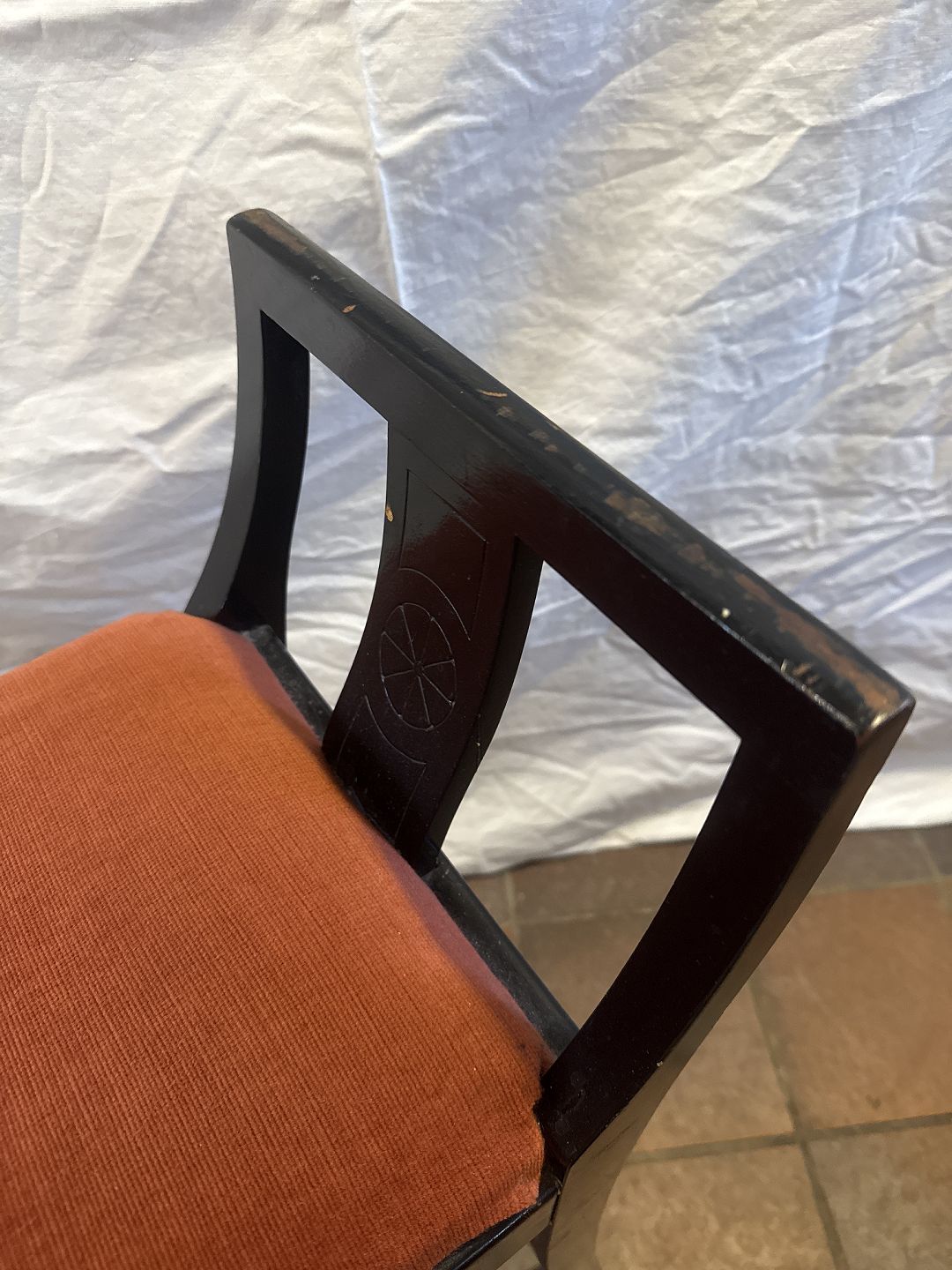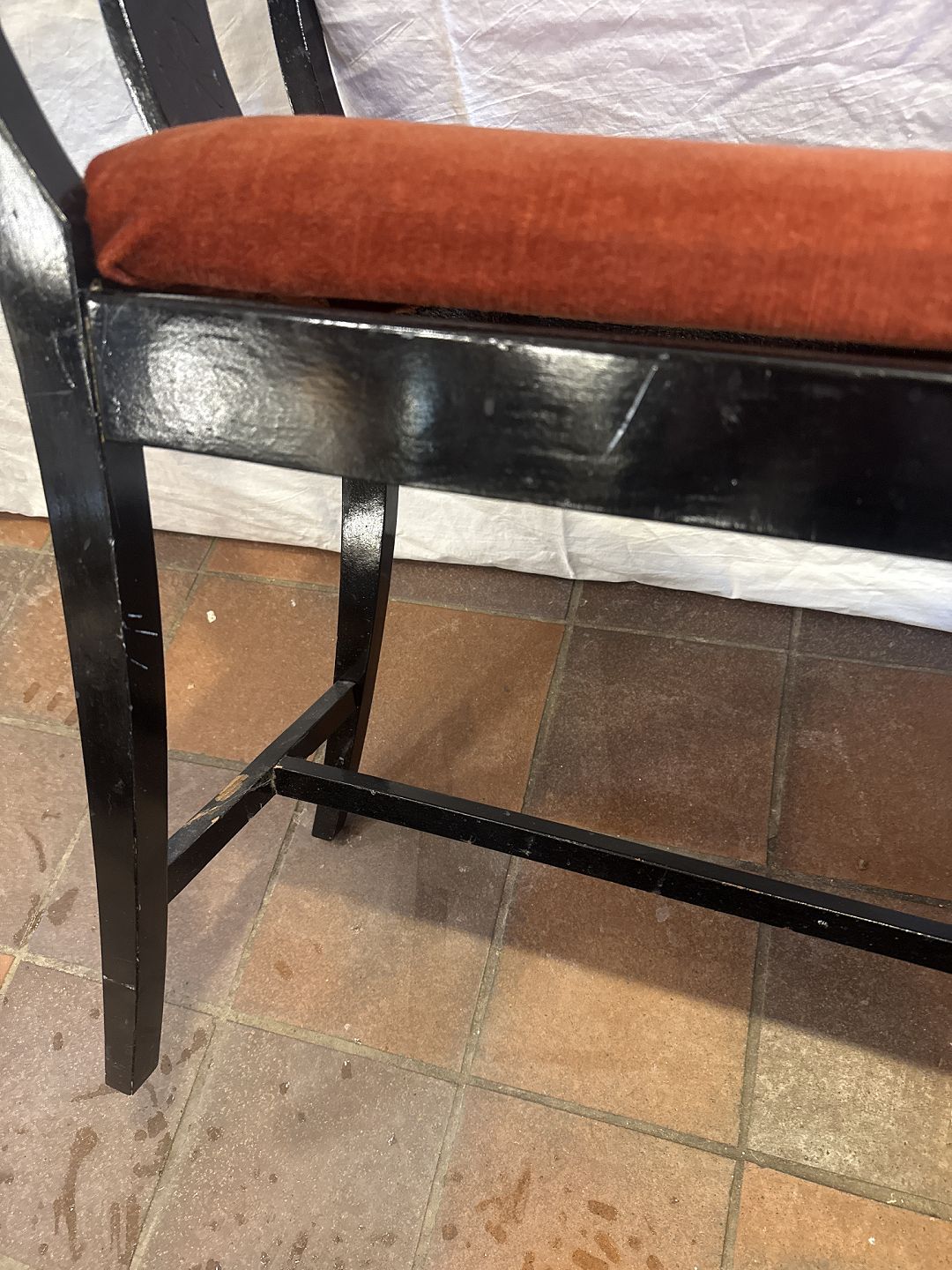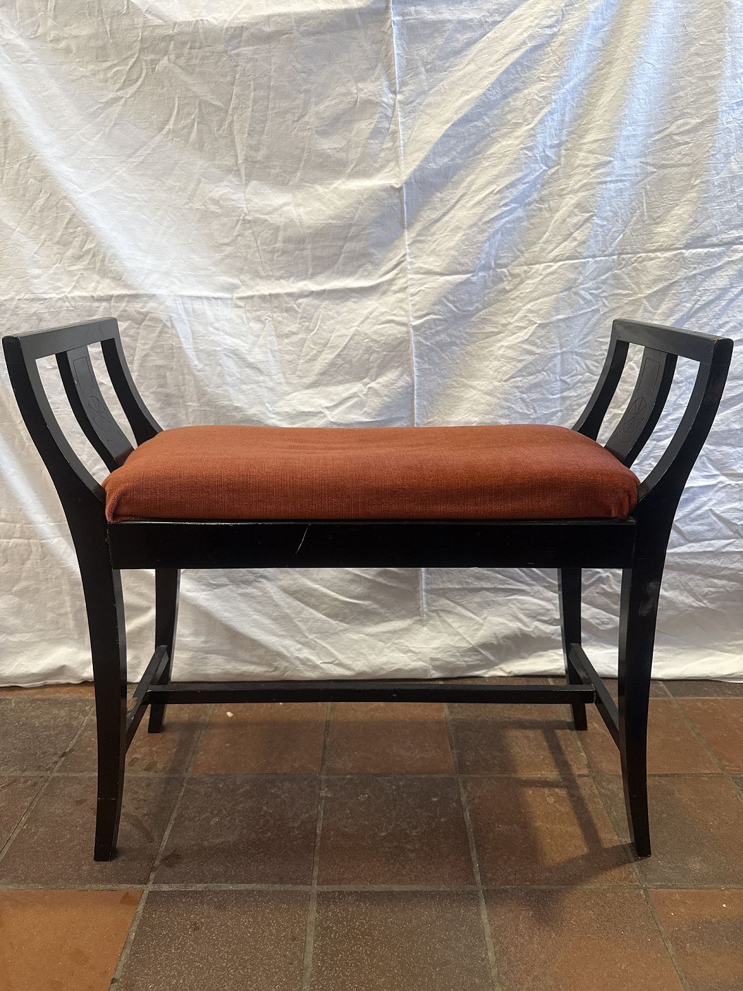 Klaverbænk i sortlakeret træ betrukket m. rødt velour stof. Udført ca. 1930'erne.