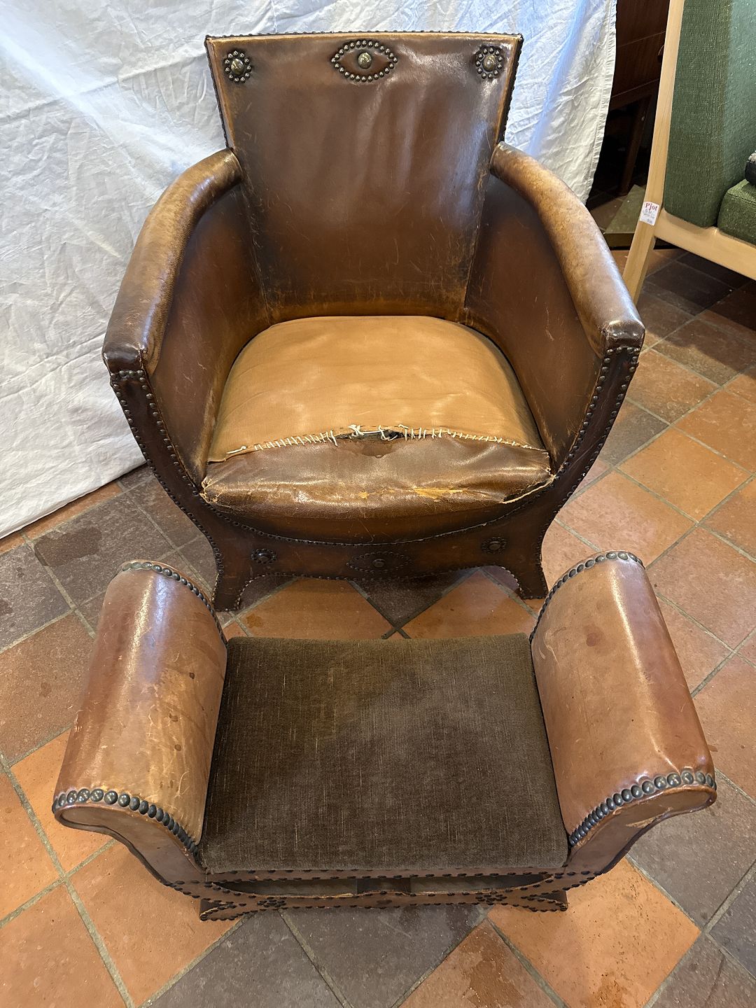 Fremstår med brugsspor, stol m. revner i skind samt pude til ombetræk.