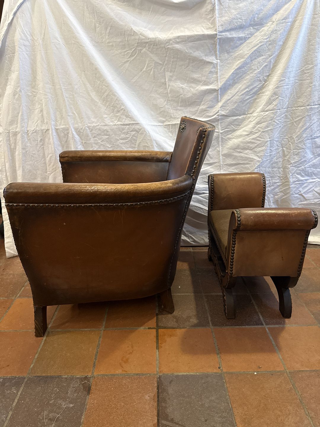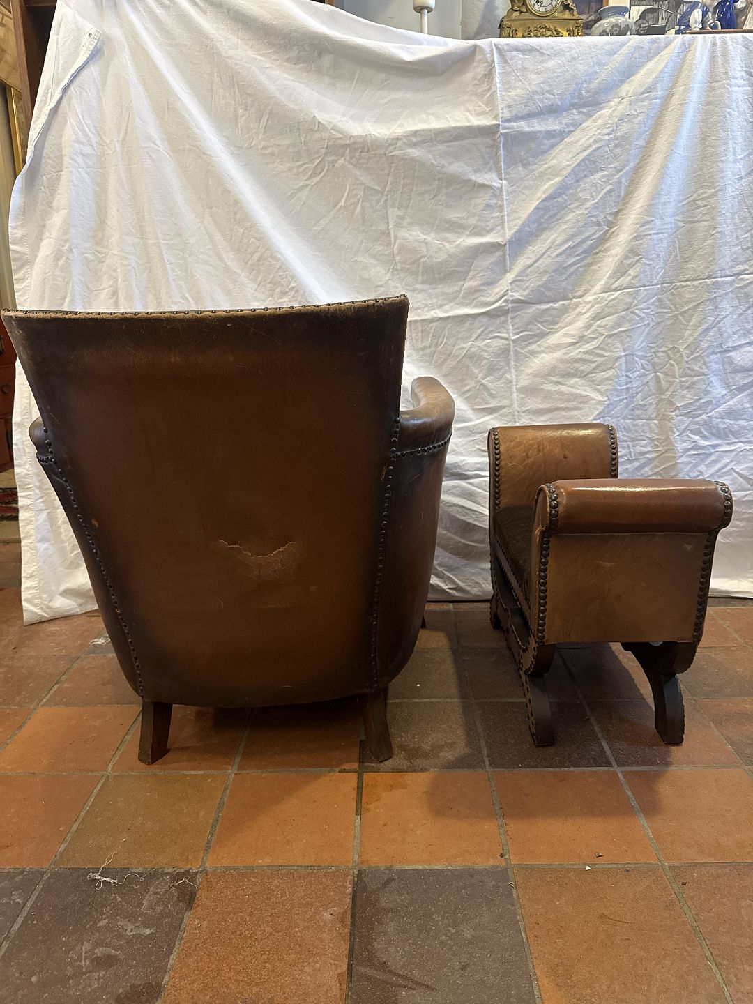 Otto Schulz lænestol i søm beslået patineret skind m. pude i stof. Samt tilhørende skammel i søm beslået skind m. sæde i velour betræk. Fremstillet af Boet, Gøteborg ca. 1930'erne.