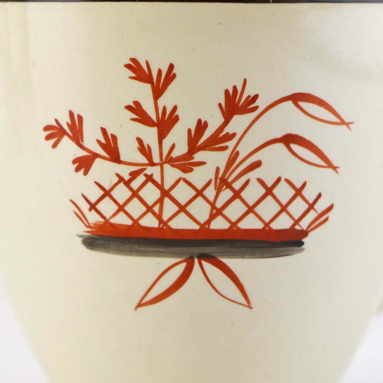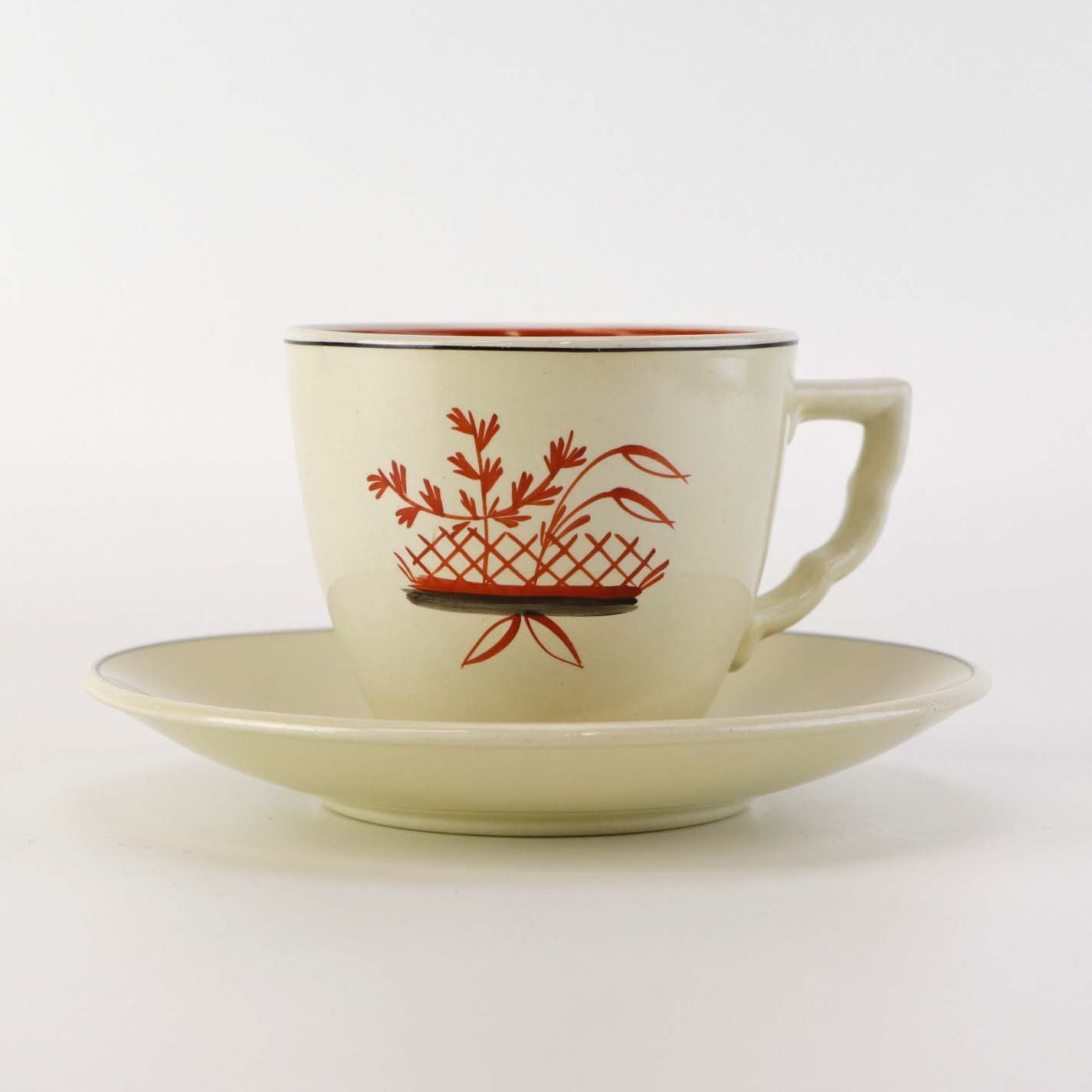 Fajancestel med dekoration af blomsterkurv på gullig baggrund med orangerød kant stribe.