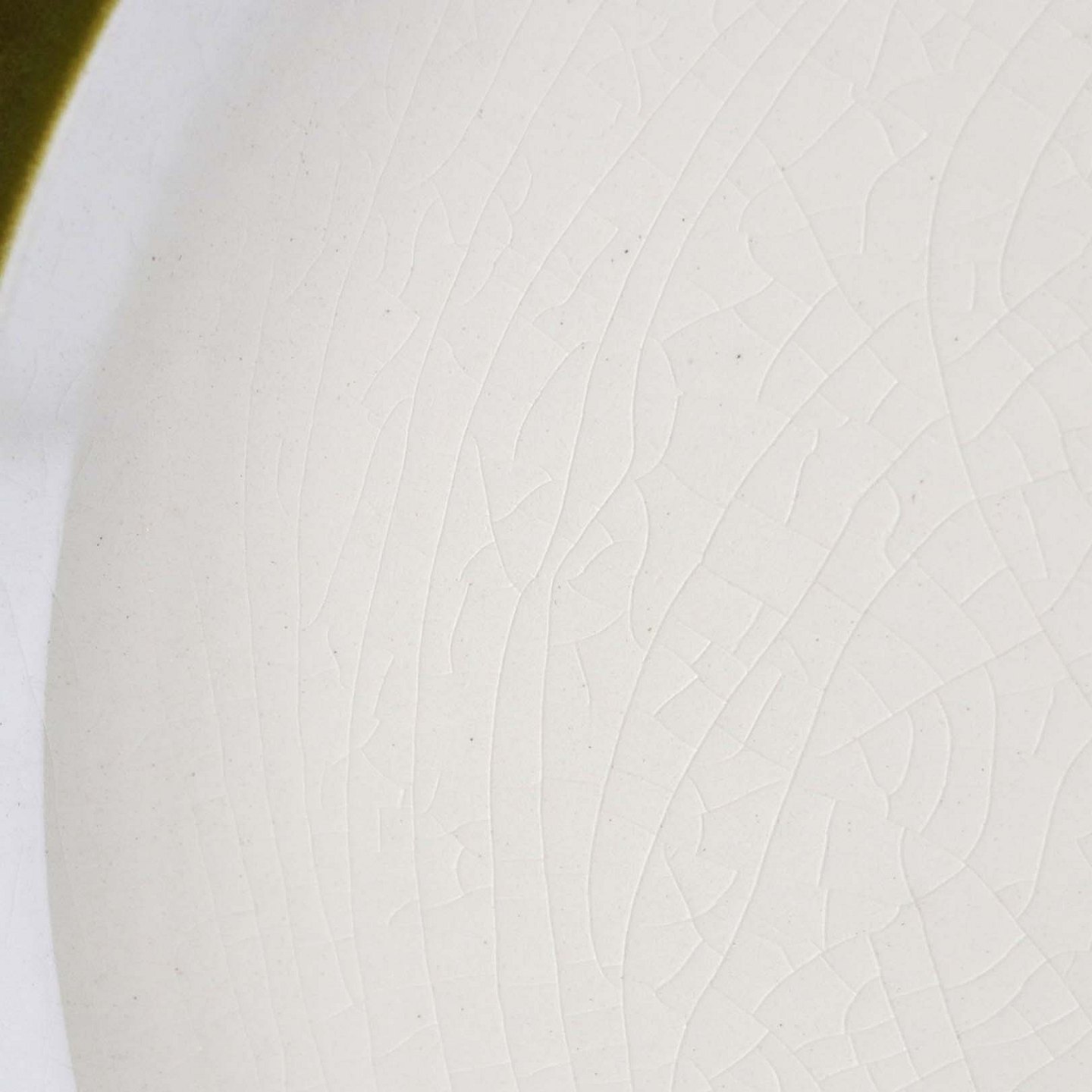 Flaskegrøn fajancestel i Prunella stelform med inderside i hvid glasur og tynd rød kant stribe.