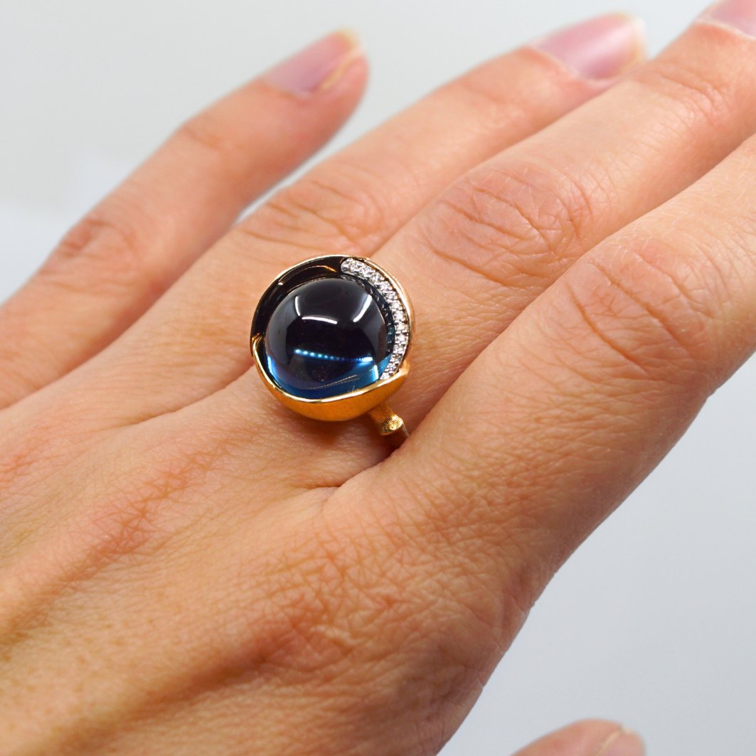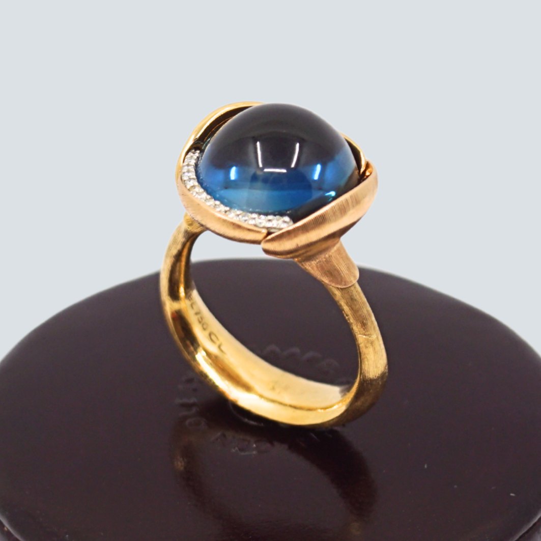 Ole Lynggaard gold jewelry.Charlotte Lynggaard for Ole Lynggaard; Lotus ring no. 3 in 18k gold, with blue topaz and 13 brilliant-cut diamonds. Two of the leaves in rose gold.