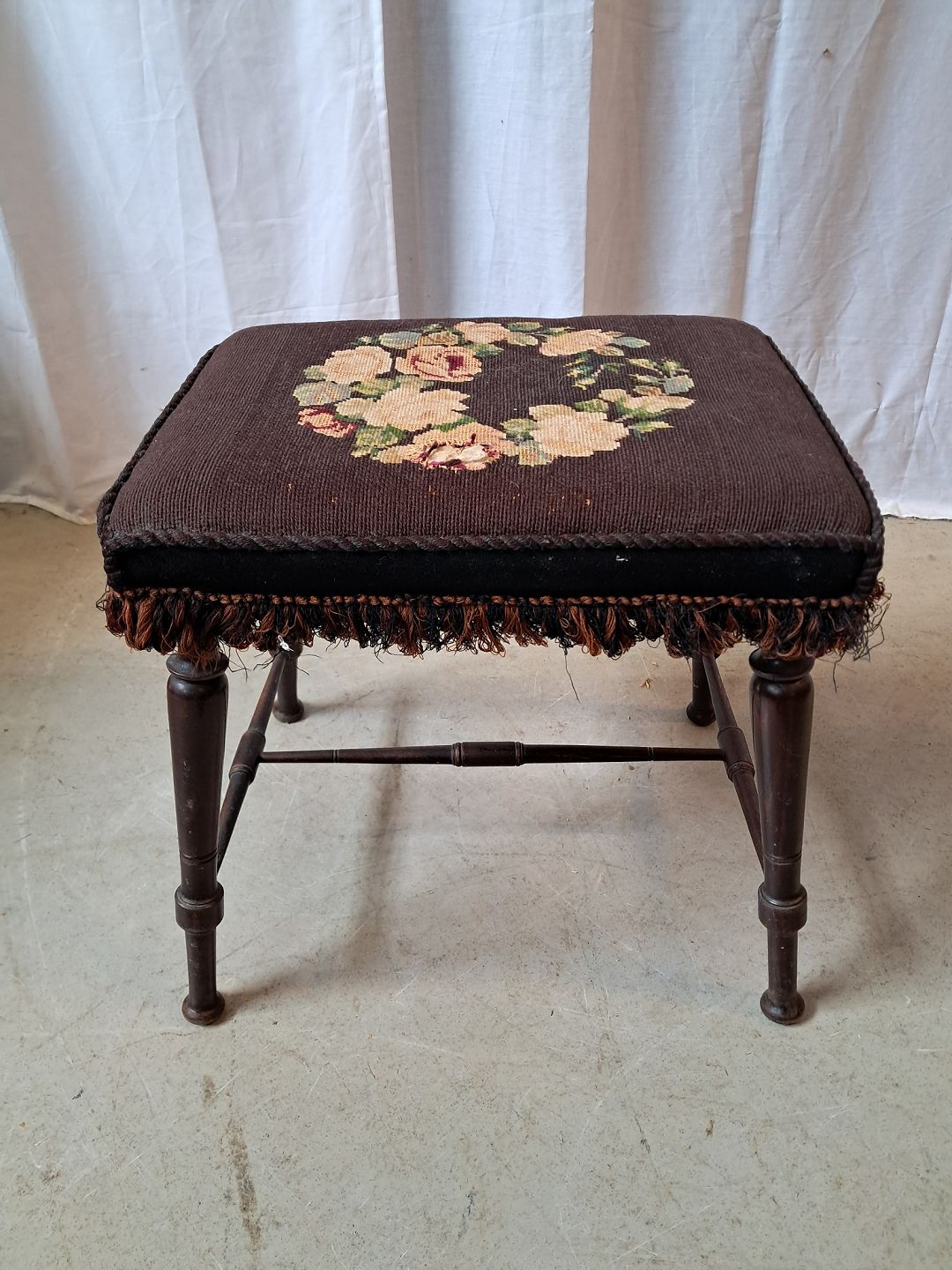 Skammel i mahogni, fra 1900erne.Den har defekt betræk.