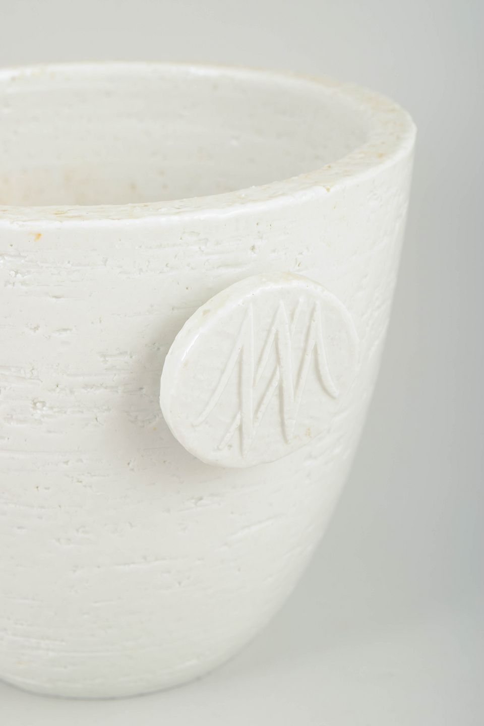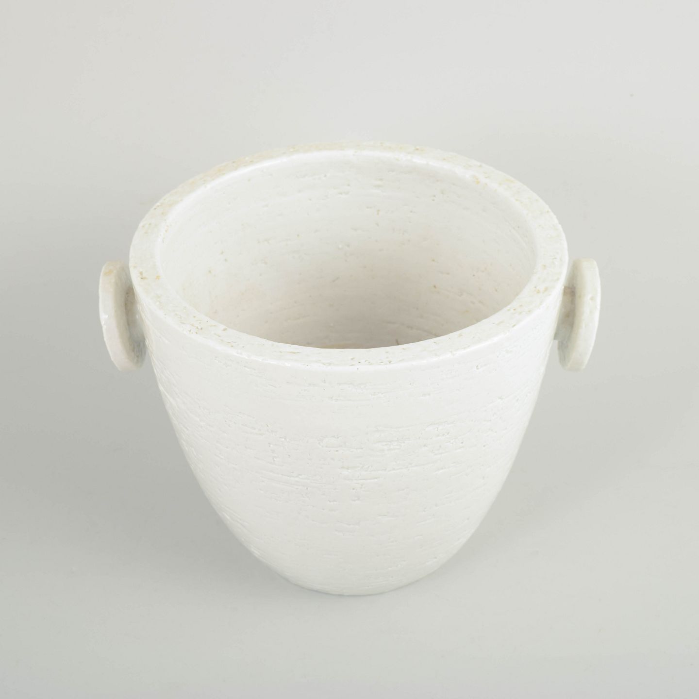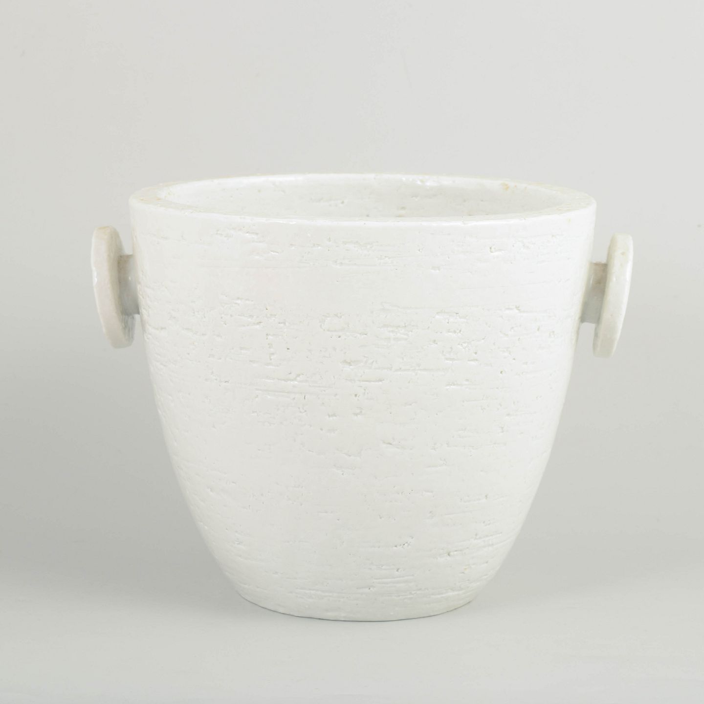 Gunnar Nylund for Rörstrand, large champagne cooler/ ice bucket.Large cylindrical champagne cooler in white glazed stoneware with a slightly conical body and two distinctive side handles. The surface shows a subtle texture with a matte white glaze. Marked on the base. Model referenced in the description.