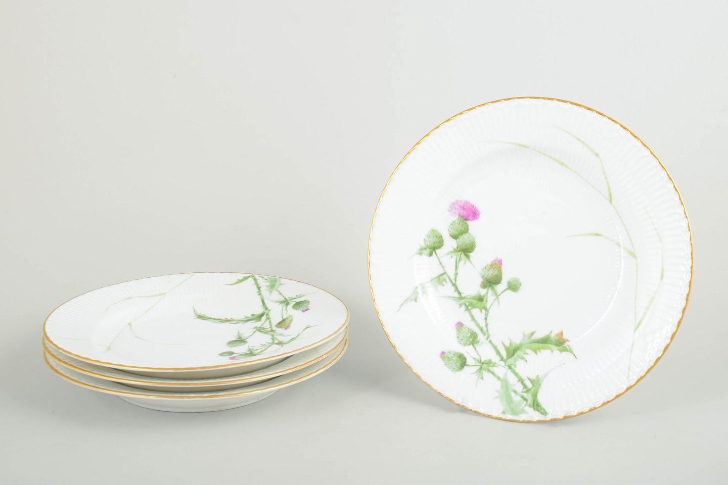 Royal Copenhagen Thistle, set of four dinner plates.Set of four hand-painted porcelain dinner plates from the Thistle series. Decorated with a naturalistic thistle motif in green and pink tones with a gilt rim. First factory quality.