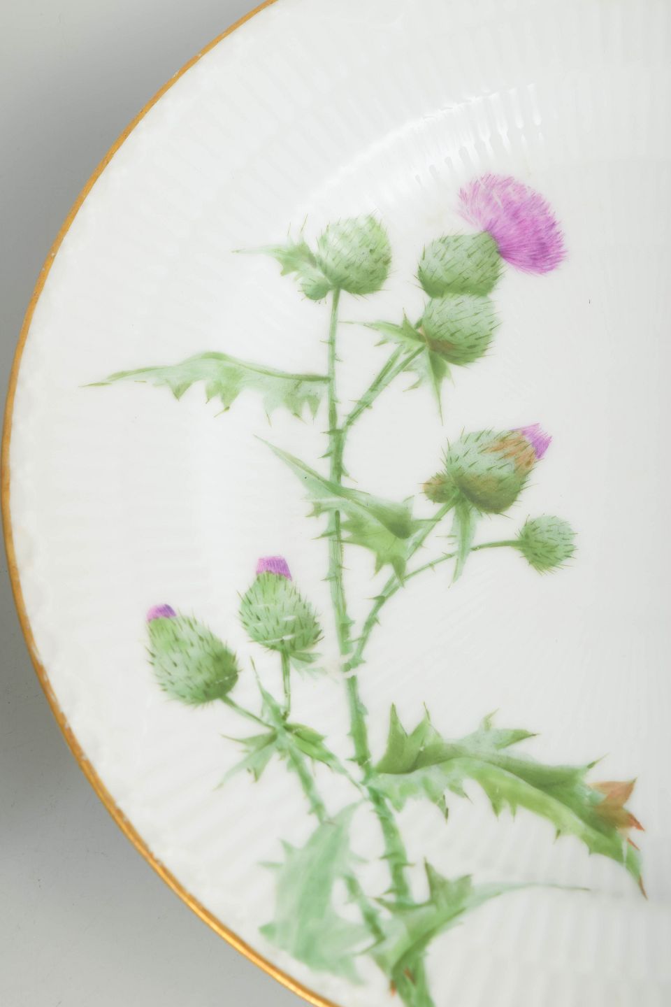 Royal Copenhagen was founded in 1775 in Copenhagen under royal patronage. The company is internationally renowned for its hand-painted porcelain and exceptional craftsmanship. Around 1900, the manufactory produced several naturalistic decorative services, including Thistle, distinguished by botanical precision and refined gilded detailing.