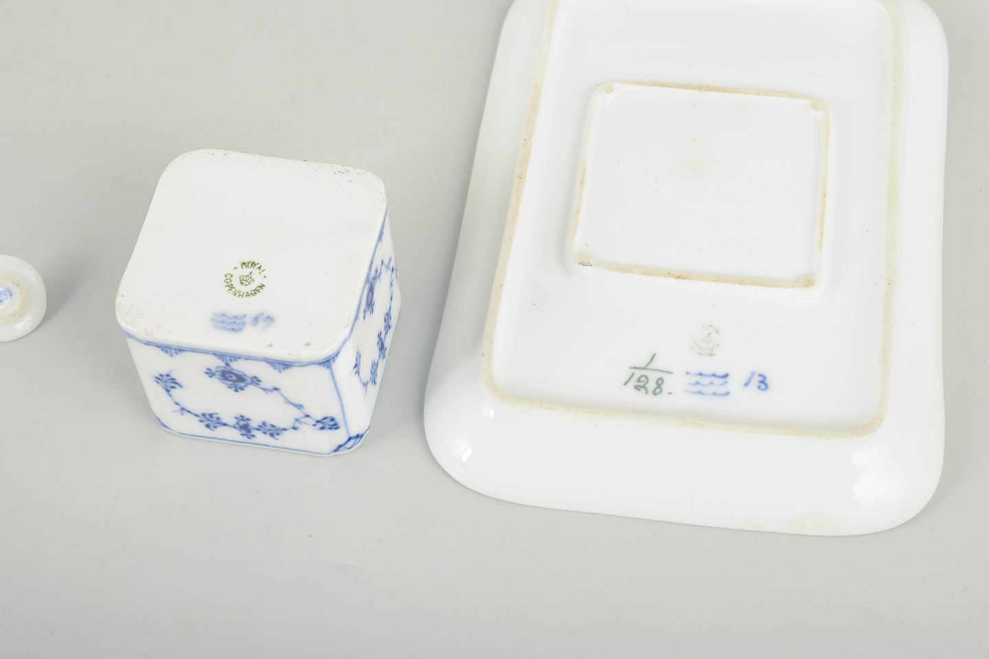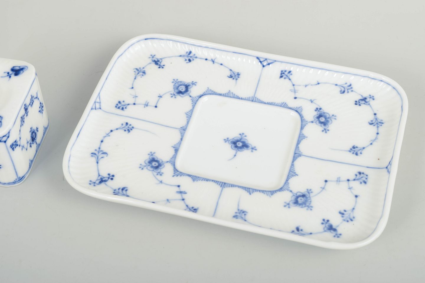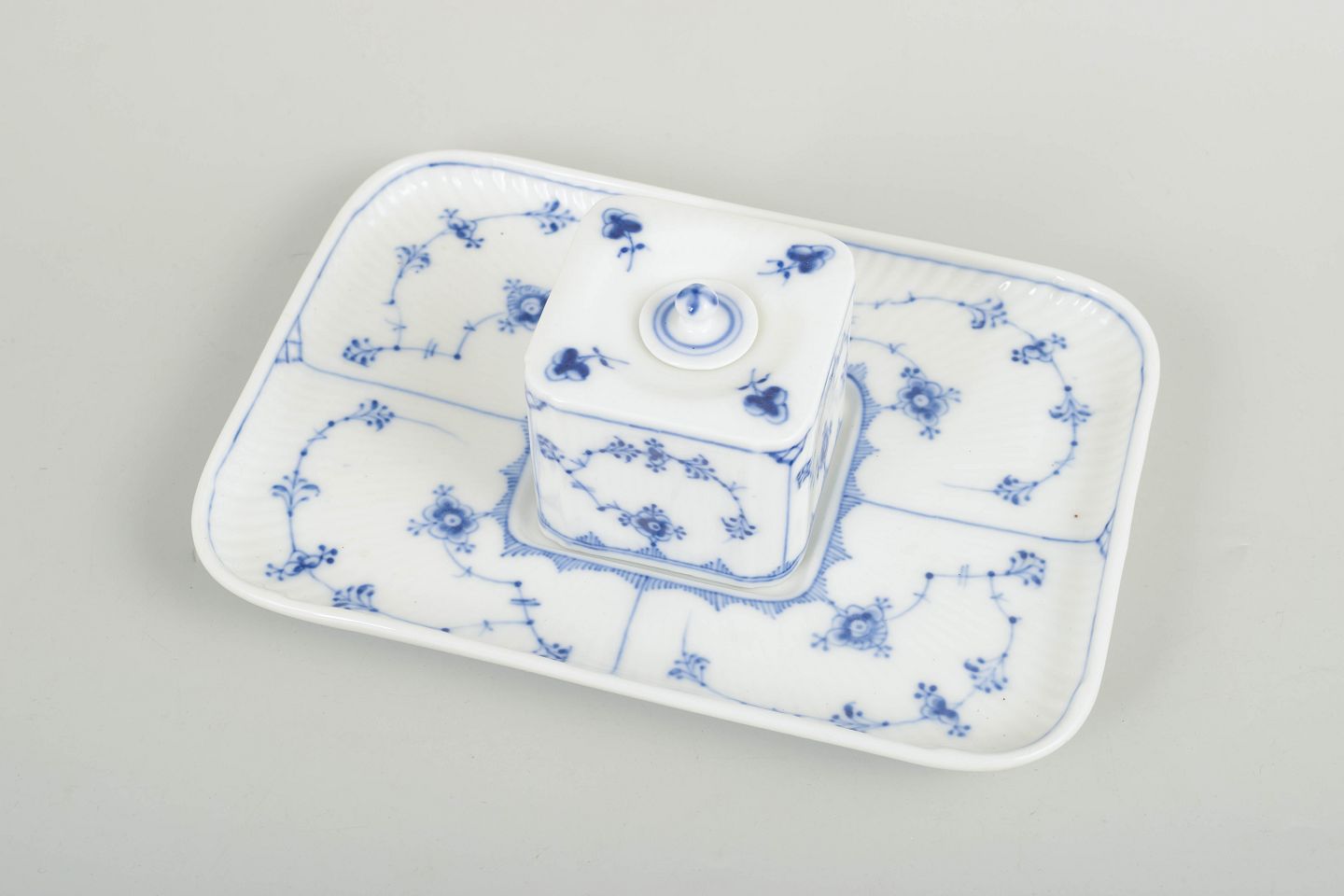 Royal Copenhagen Blue Fluted Plain inkwell.Rectangular inkwell with integrated square ink container and lid in white glazed porcelain with hand-painted blue underglaze decoration in the Blue Fluted Plain pattern, model 1/128. 1st factory quality.