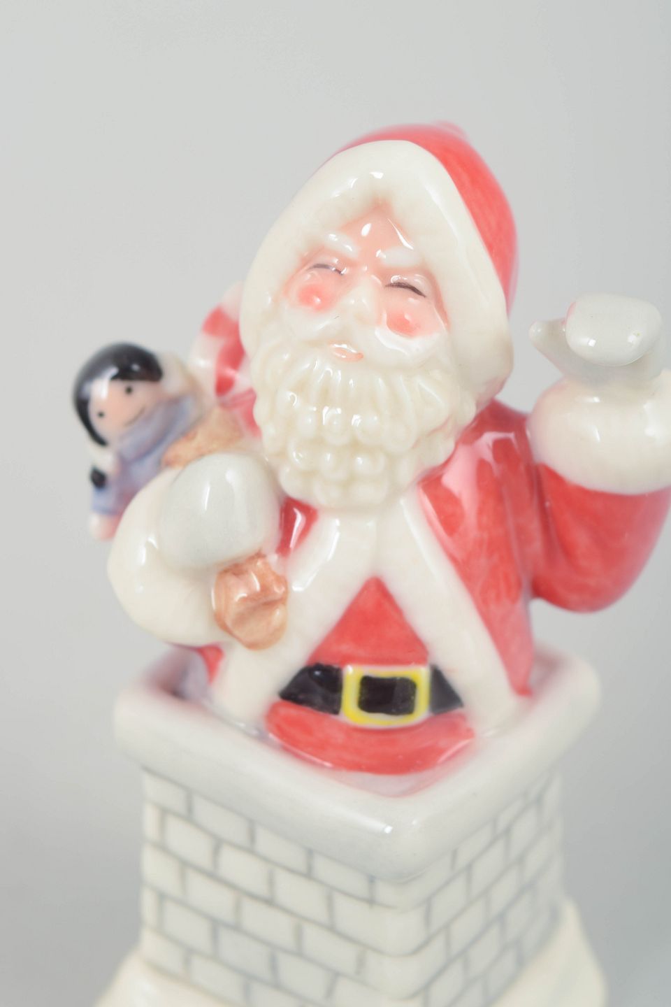 Royal Copenhagen, Santa Claus figurine.Decorative Santa Claus figurine in hand-painted porcelain from 2004, depicted standing in a chimney holding a small doll. The figure is finely modelled with classic red coat, white fur trim and black belt. Comes with original box. First factory quality.