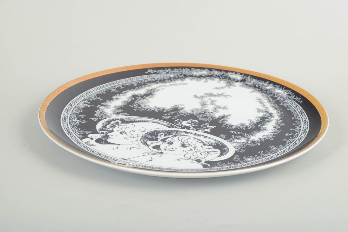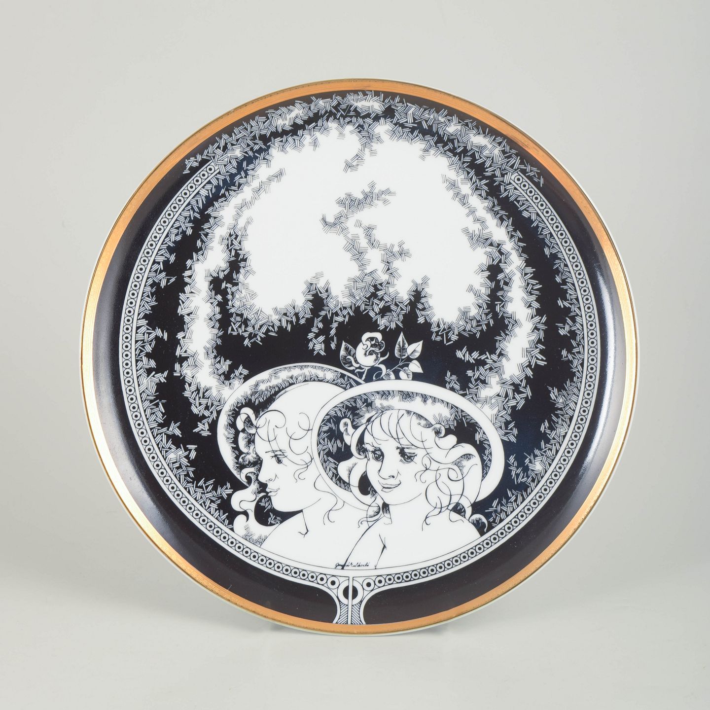 Hollóháza, large dish.Large round dish in white glazed porcelain with black decorative border and figural motif on the lid. Produced by the Hollóháza Porcelain Manufactory.