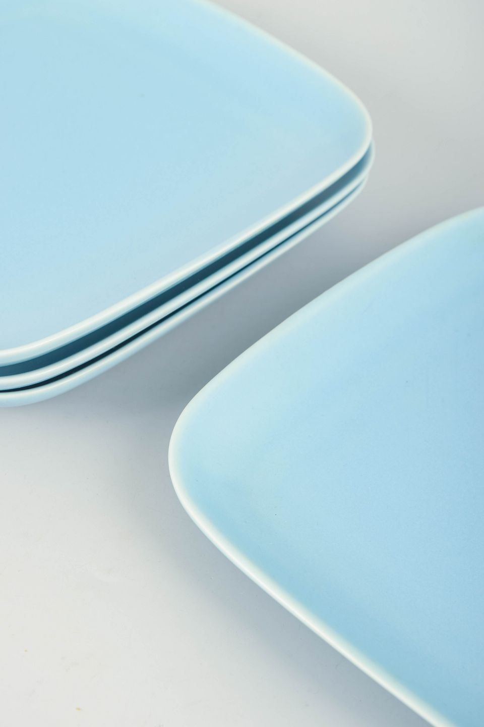 Höganäs Keramik, set of four dinner plates in turquoise glaze.Square dinner plates in stoneware with rounded corners and an even turquoise glaze.