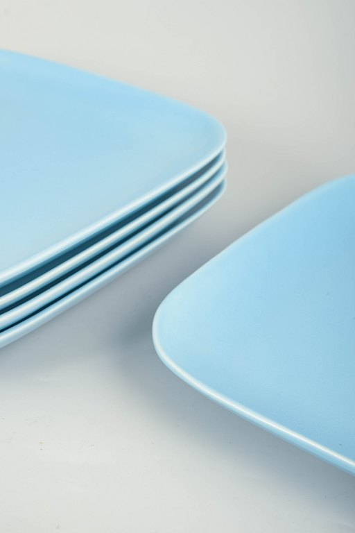 Höganäs Keramik, set of five dinner plates in turquoise glaze.Square dinner plates in stoneware with rounded corners and an even turquoise glaze.