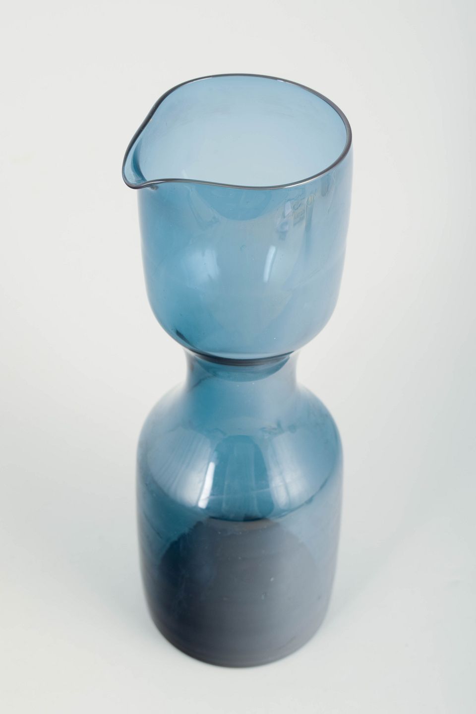Kjell Blomberg for Gullaskruf, pitcher.Slender hourglass-shaped pitcher in mouth-blown glass with a gently waisted neck and subtle pouring lip. Executed in transparent blue with a darker base section, characteristic of Swedish glass design of the 1960s.
