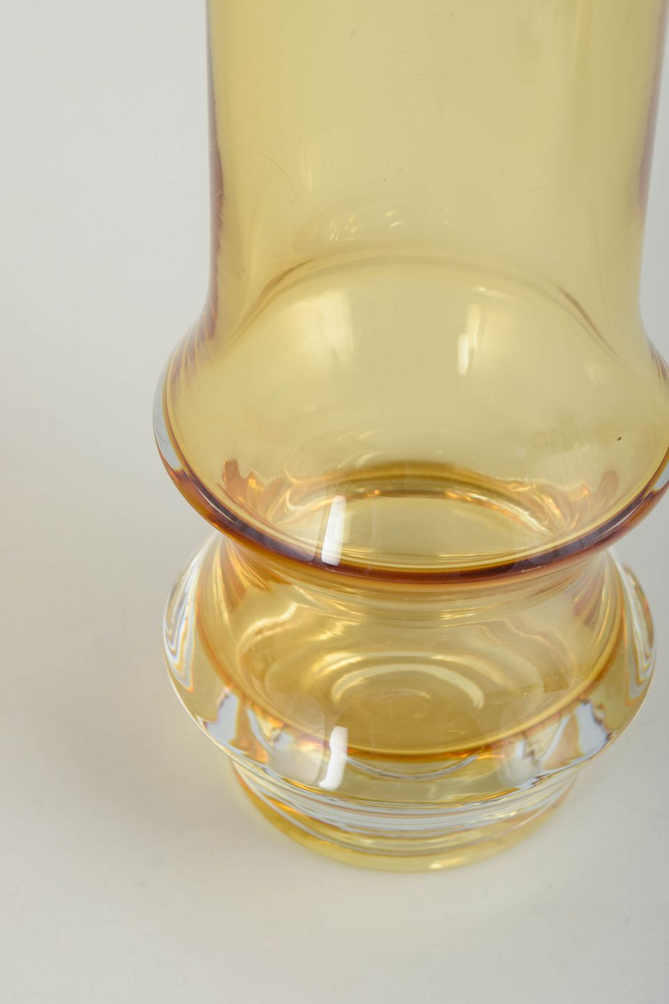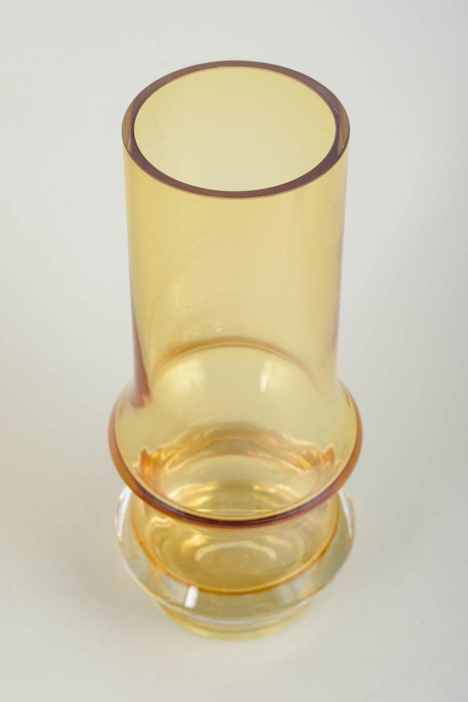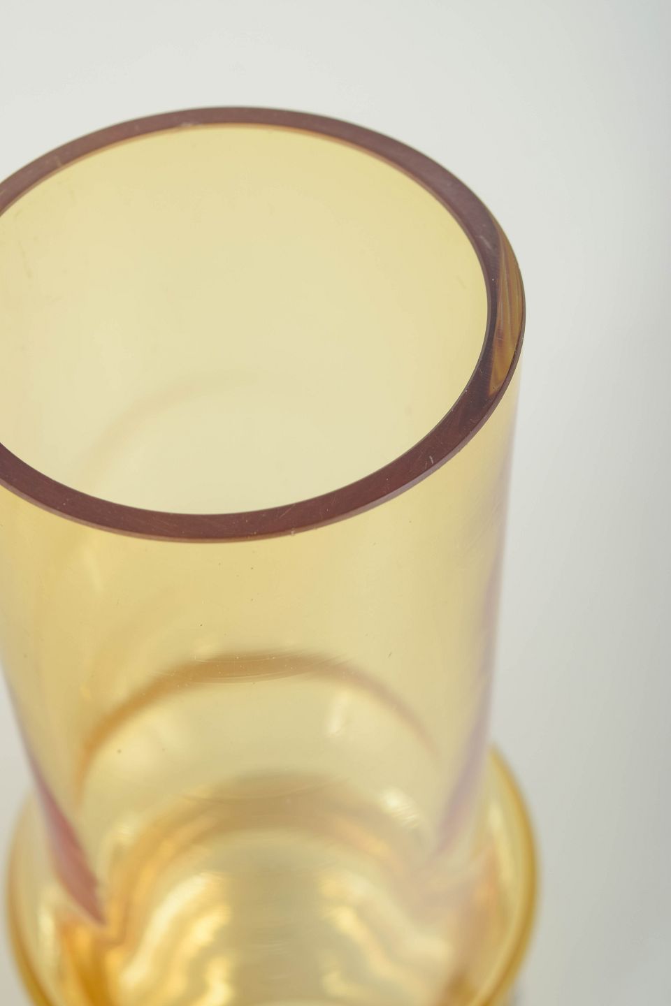 Tamara Aladin for Riihimäen Lasi, art glass vase.Tall cylindrical vase in amber art glass with slightly flared rim and a pronounced profiled base. Executed in mouth-blown glass with a warm golden tone and a solid clear foot. Unsigned.