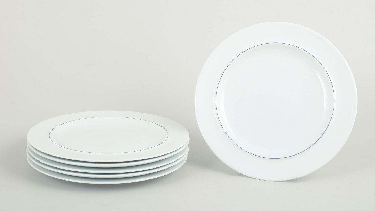 Grethe Meyer for Royal Copenhagen, set of six Blue Line lunch plates.Six round plates model 621 in white faience with a simple blue line along the rim. Part of the Blue Line series with its strict and functional design language. Produced 1992–1999. 1st factory quality.