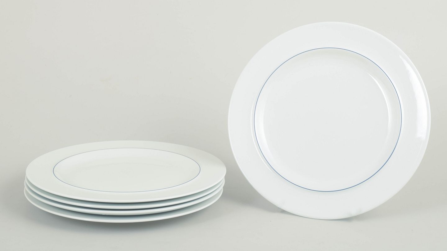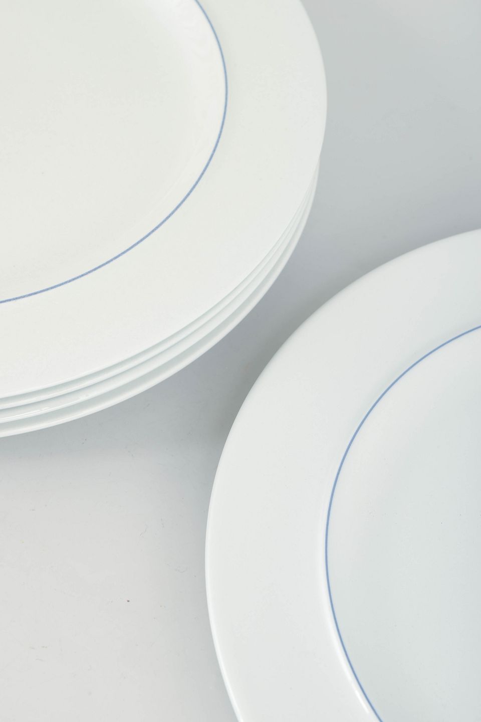 Grethe Meyer for Royal Copenhagen, set of five Blue Line lunch plates.Five round plates model 621 in white faience with a simple blue line along the rim. Part of the Blue Line series with its strict and functional design language. Produced 1992–1999. 1st factory quality.