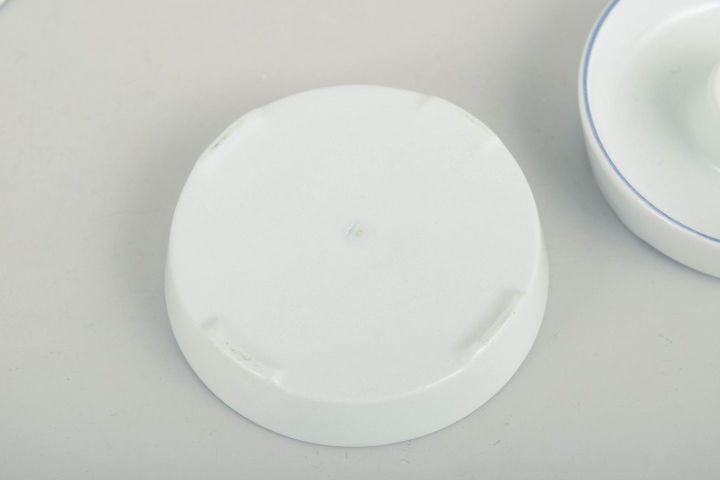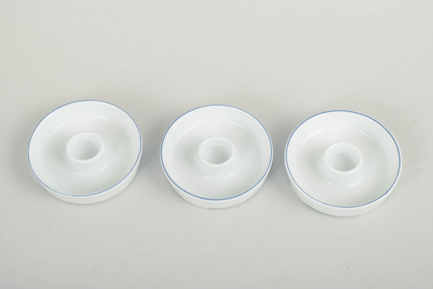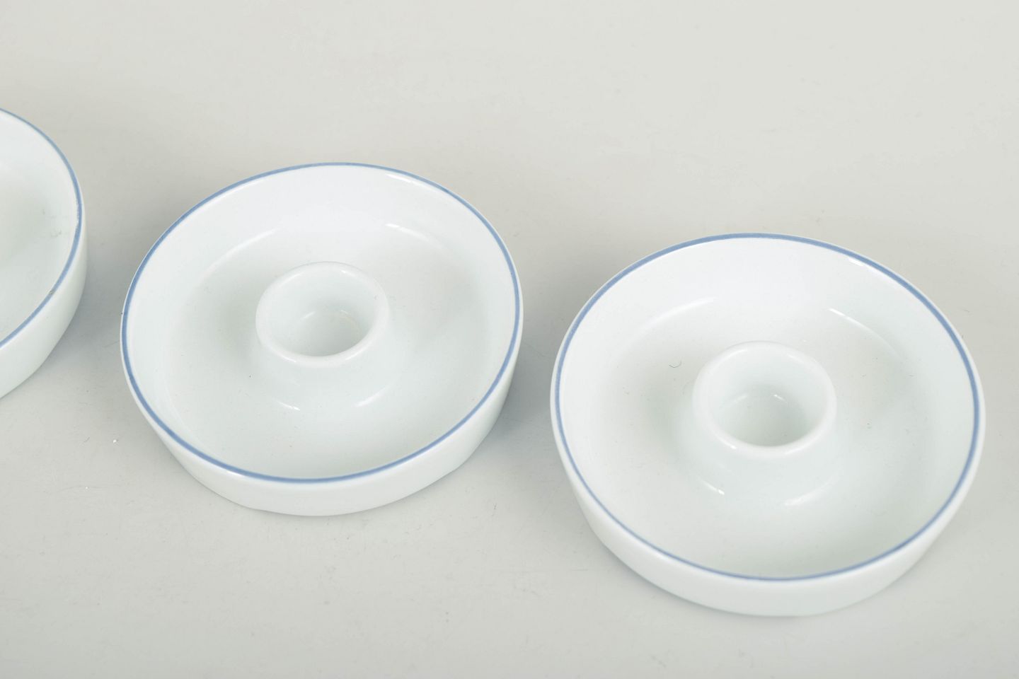 Grethe Meyer for Royal Copenhagen, set of three small Blue Line candlesticks.Three small round candlesticks in white glazed porcelain with a simple blue line along the rim. The design forms part of the Blue Line series and reflects the strict functionalist aesthetic of the 1970s. Unmarked.