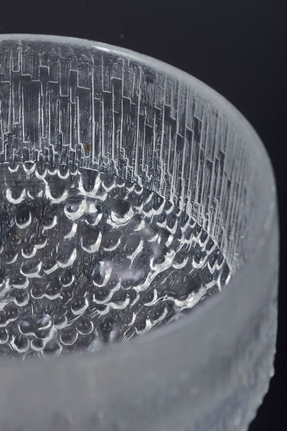 Tapio Wirkkala for Iittala, bowl.Pressed clear glass bowl from the Ultima Thule series, defined by its distinctive textured surface inspired by melting ice and Arctic landscapes. Unmarked.