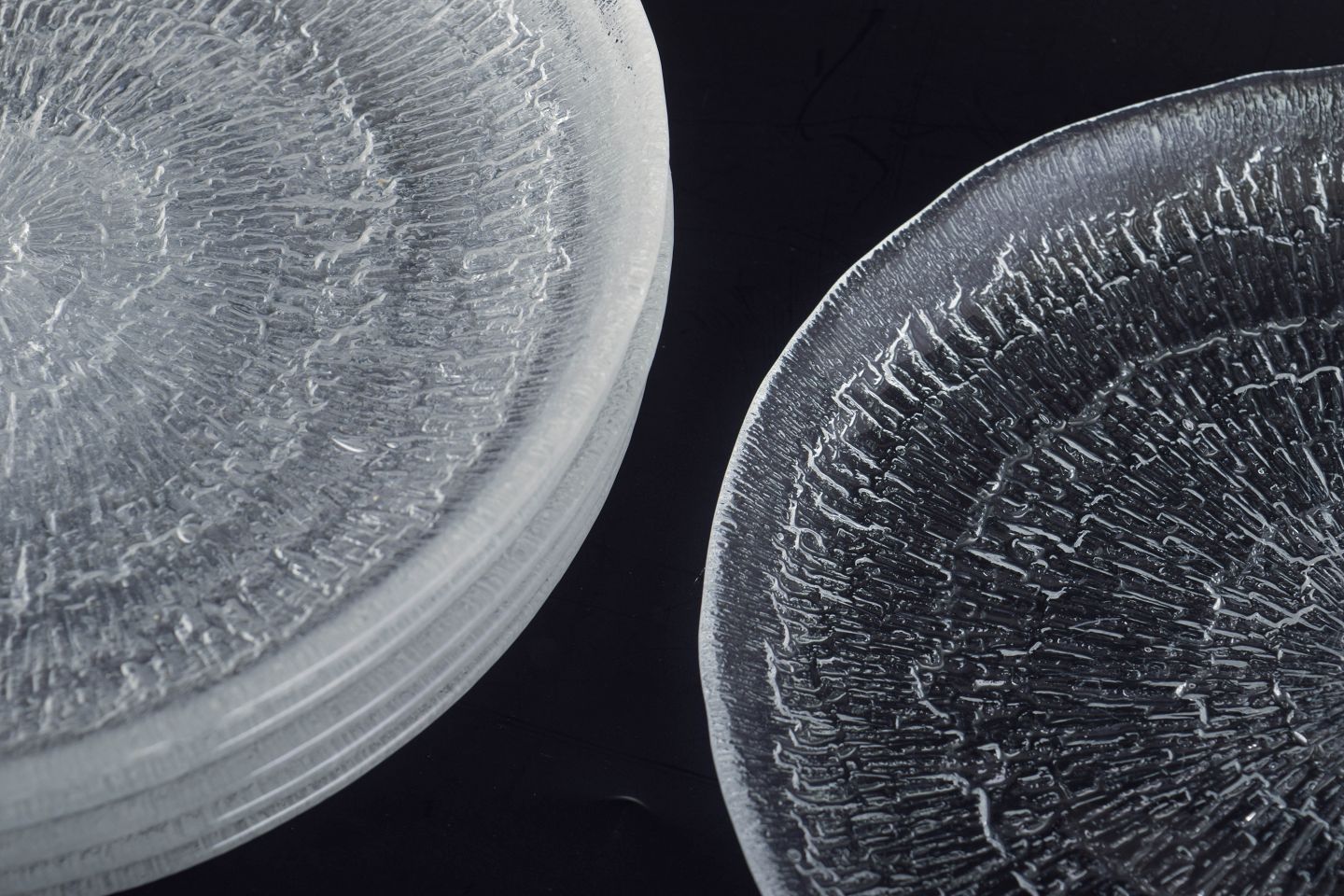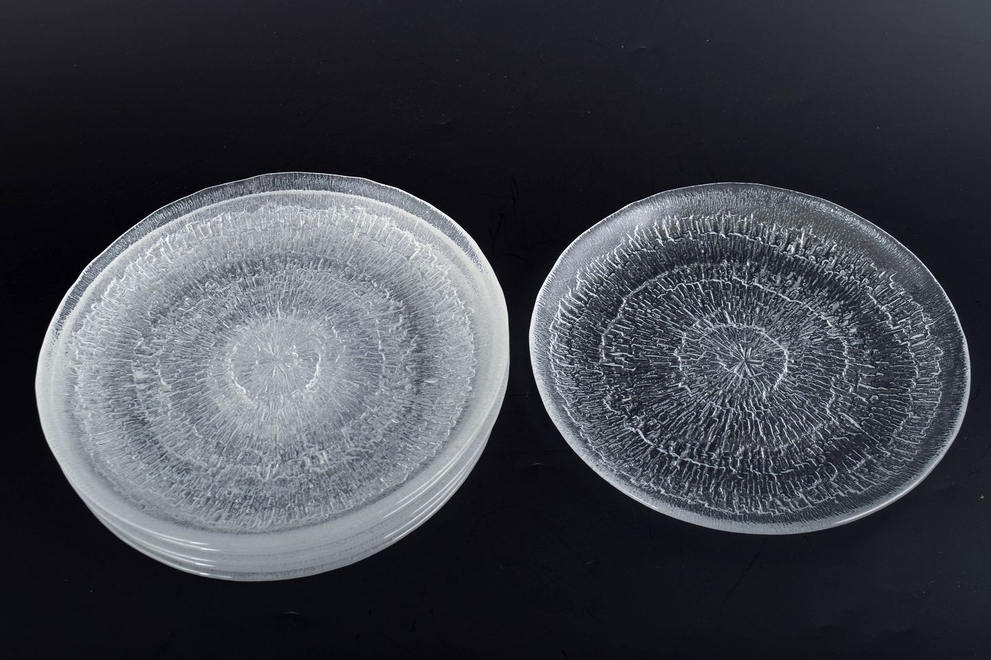 Tapio Wirkkala for Iittala, set of six plates.Set of six pressed clear glass plates from the Ultima Thule series, defined by its distinctive heavily textured surface inspired by melting ice and Arctic landscapes. Unmarked.