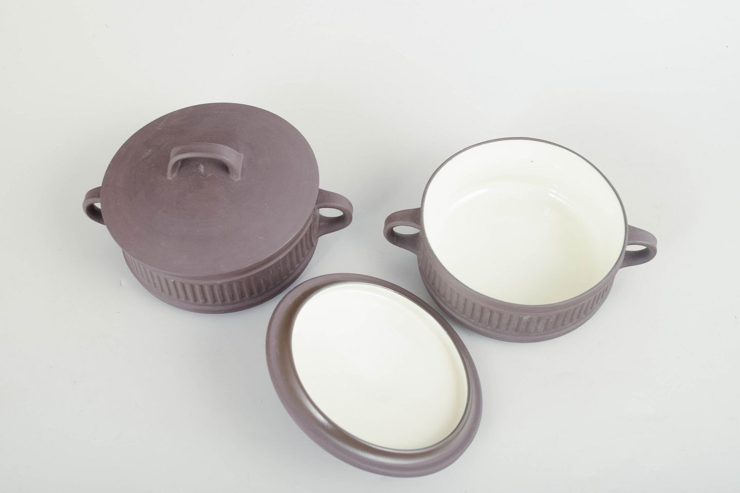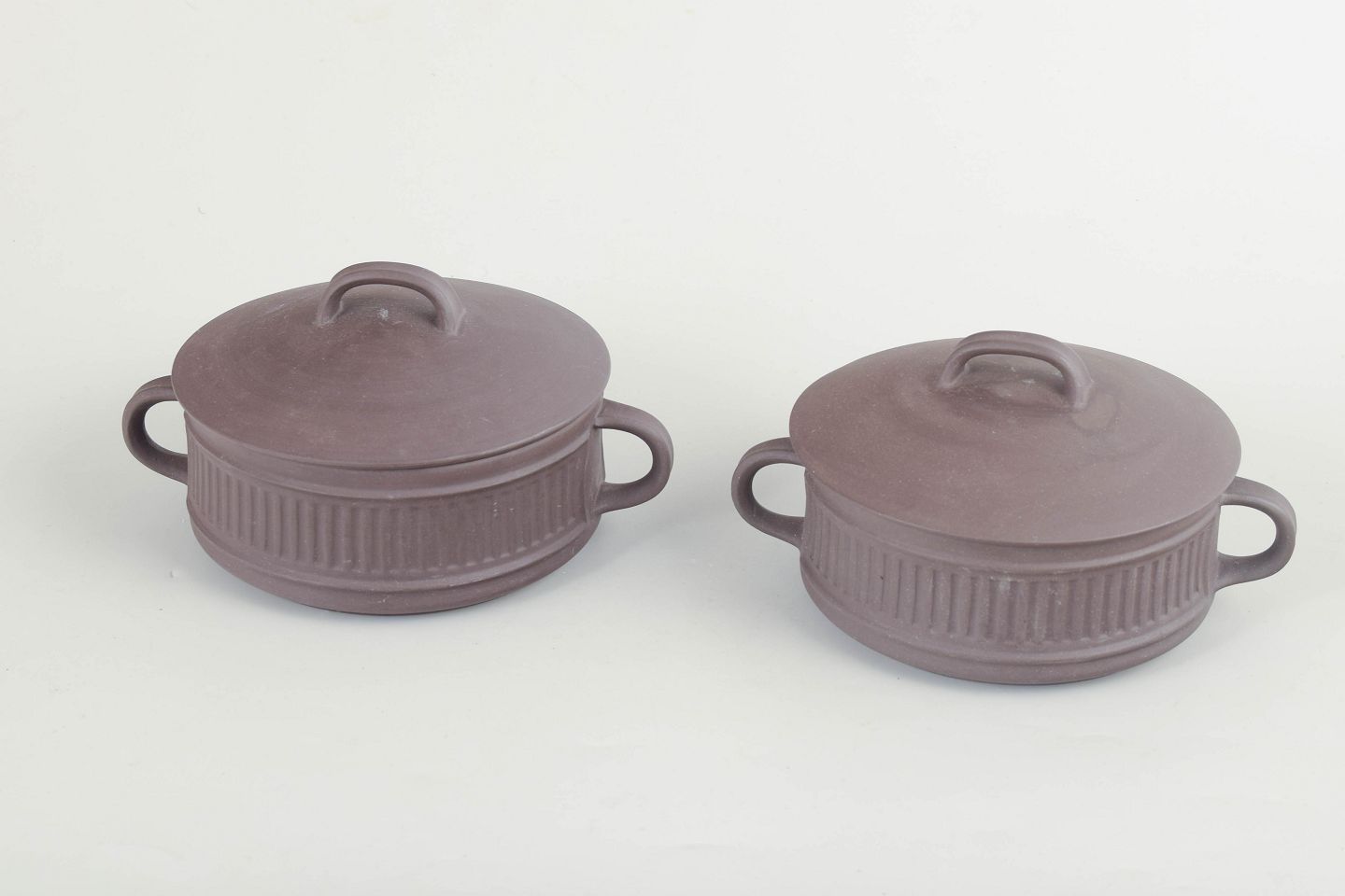 Jens Harald Quistgaard for Dansk Designs, set of 2 lidded bouillon cups.Two stoneware bouillon cups with lids and side handles, executed in a white glaze with ribbed decoration.