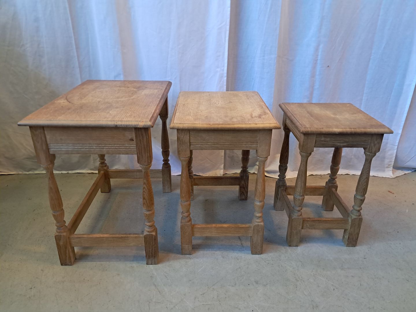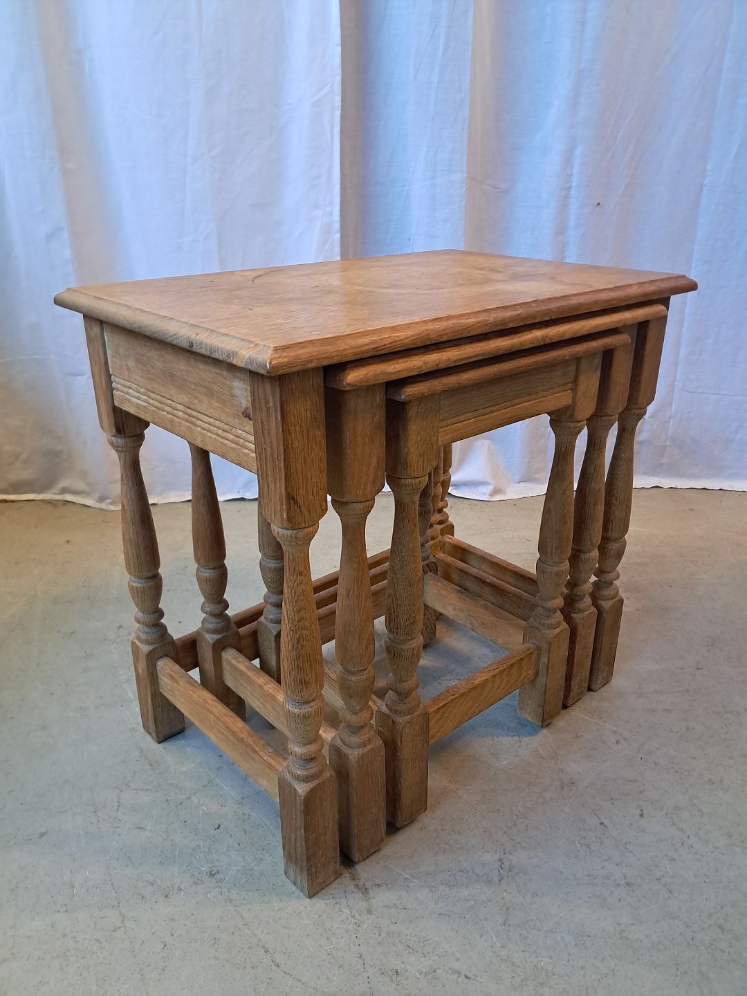 3 Indskudsborde i massivt egetræ, fra 1980erne.De har brugsspor.