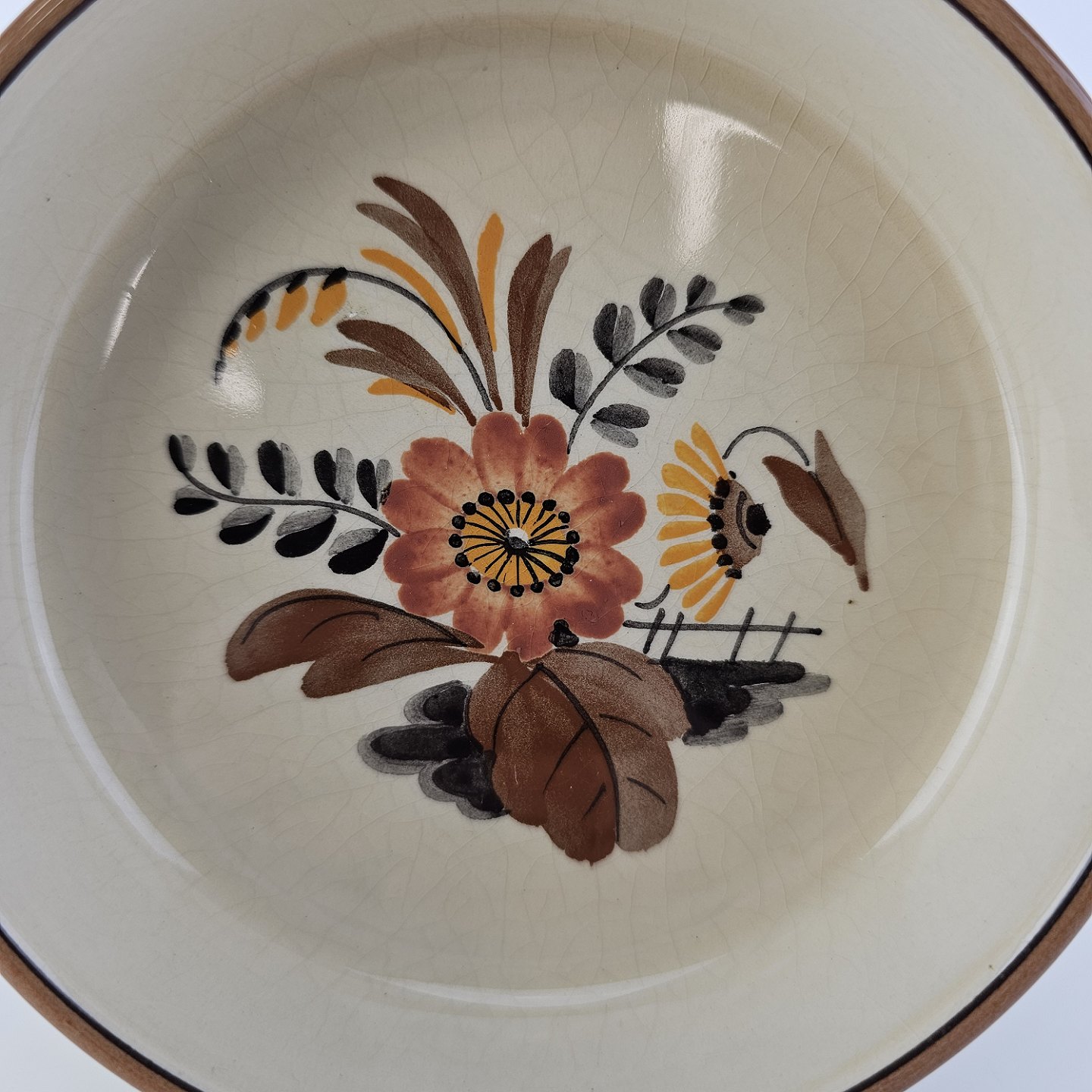 Knud er cremefarvet fajance dekoreret med flettet kant og brune og orange blomster. Stellet blev produceret i år 1934-1963.