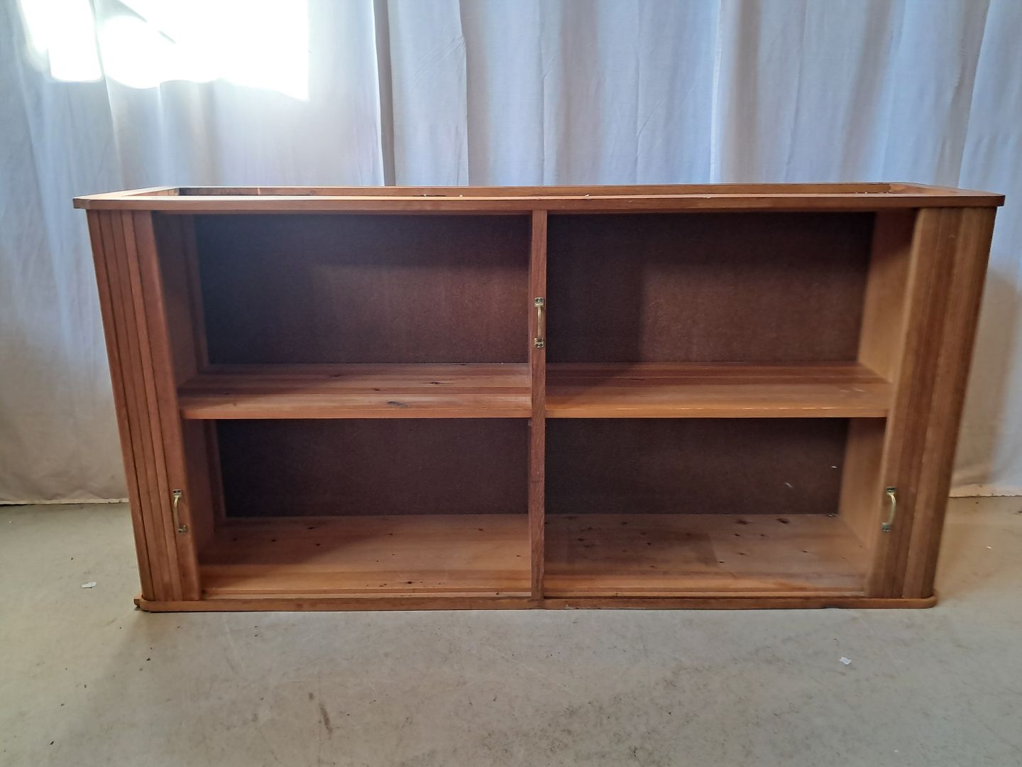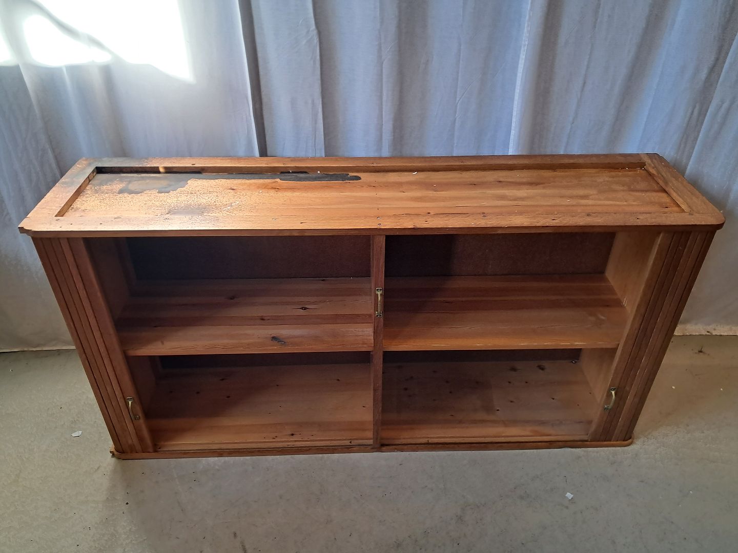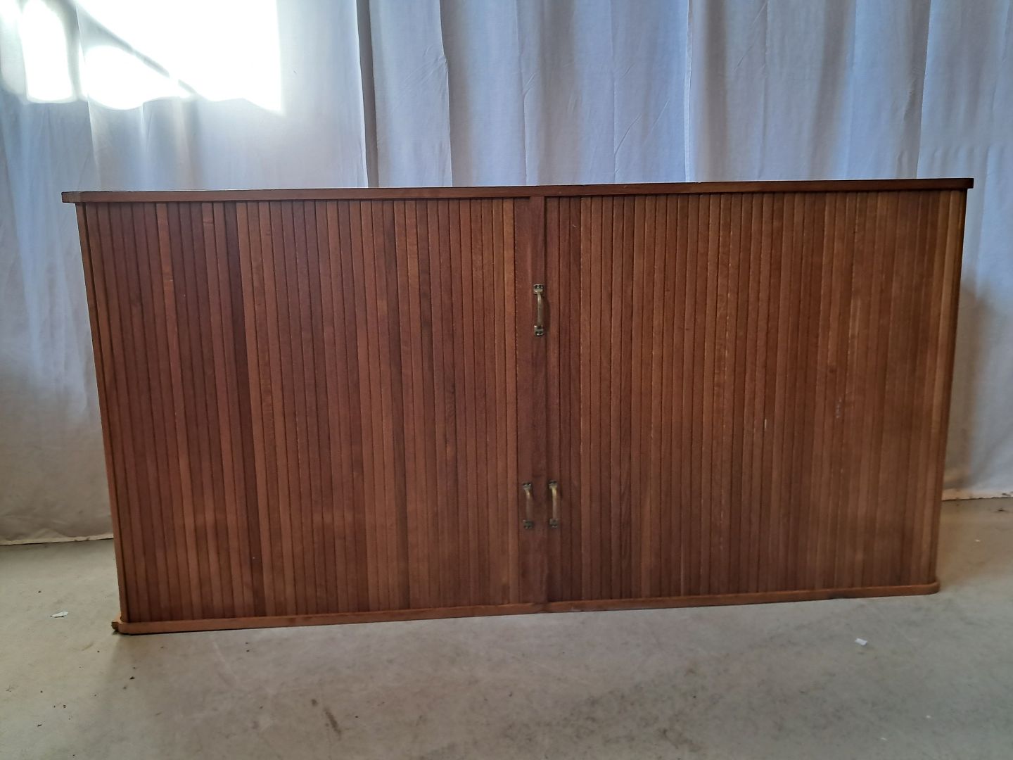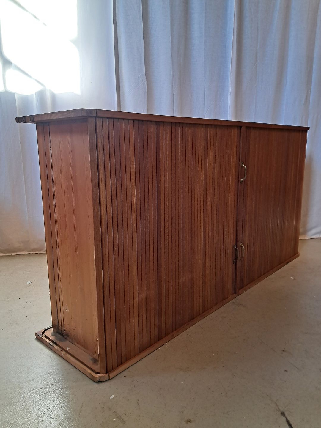 Jalousiskab i fineret egetræ, fra 1950erne.Det har brugsspor og defekter.