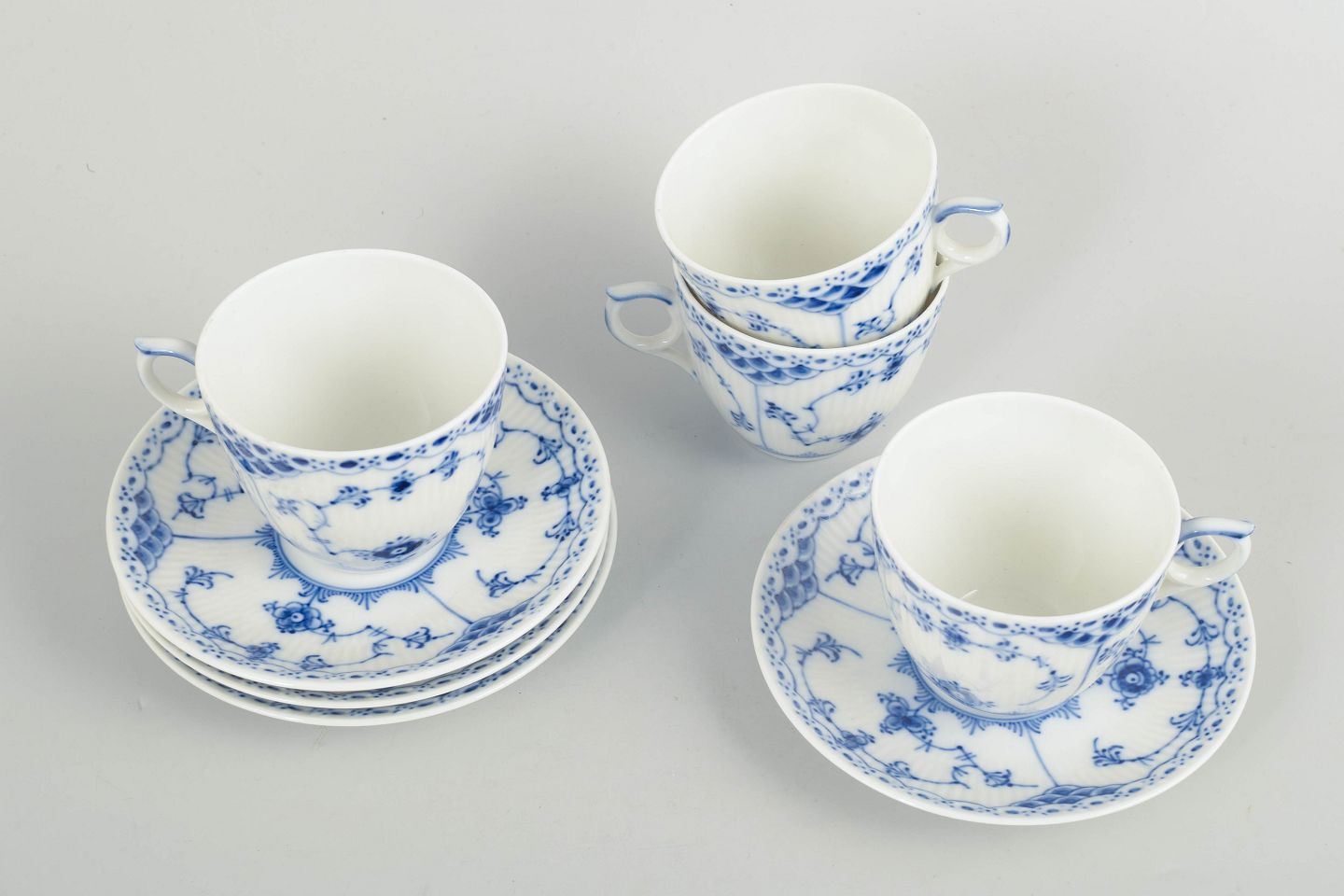 Royal Copenhagen Blue Fluted Half Lace, set of four coffee cups with matching saucers.Set of four coffee cups with matching saucers in hand-painted porcelain from the Blue Fluted Half Lace service with classic underglaze decoration in cobalt blue, fluted panels and characteristic lace border. Model 1/756. First factory quality. Produced in 1966.