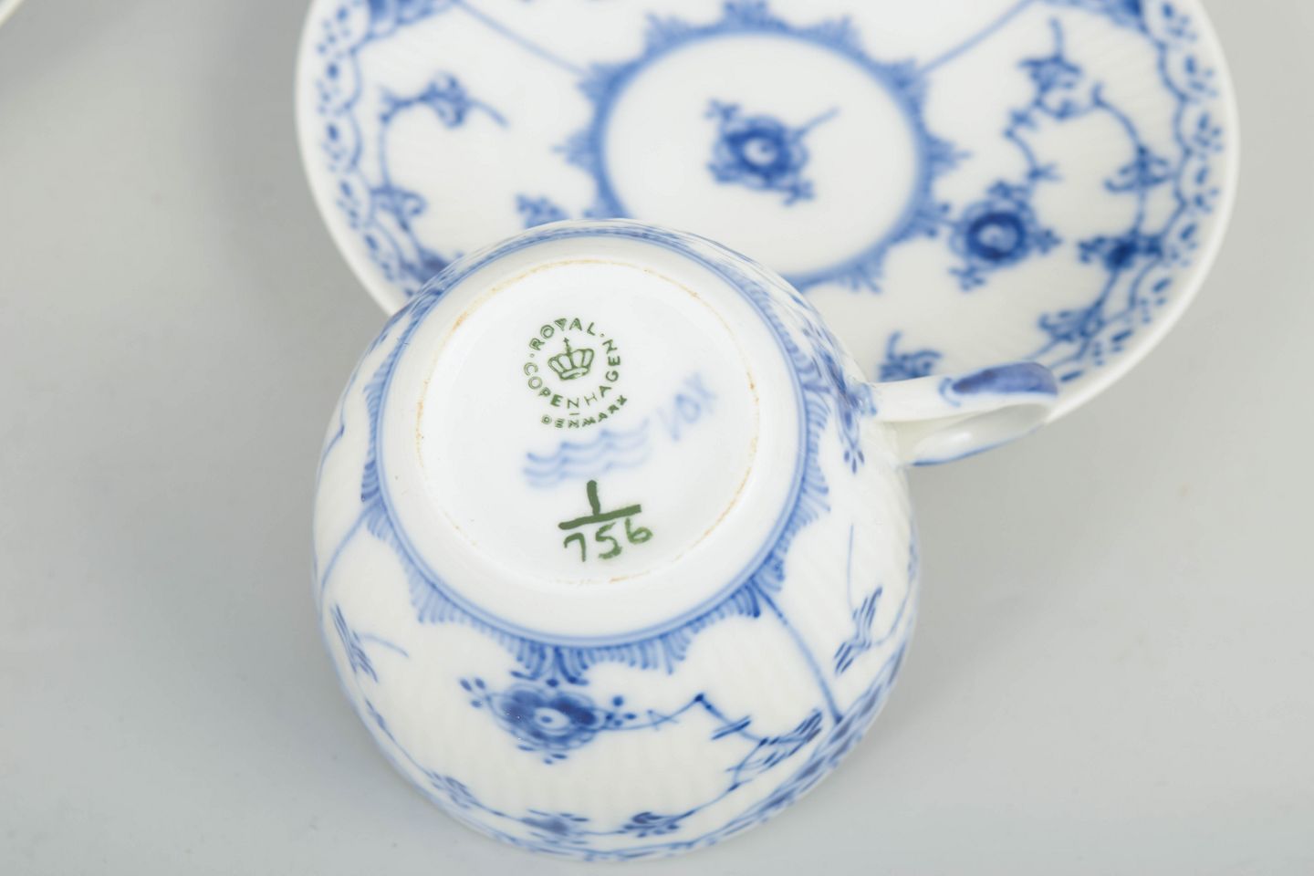 Royal Copenhagen was founded in 1775 in Copenhagen under royal charter. The factory is internationally recognised for its hand-painted porcelain and high artistic standards. Blue Fluted Half Lace is a variation of the classic Blue Fluted service, combining fluted surfaces with a decorative lace border executed with exceptional craftsmanship.