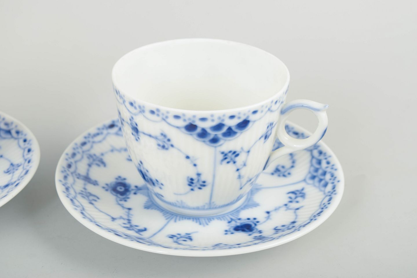 Royal Copenhagen Blue Fluted Half Lace, set of two coffee cups with matching saucers.Set of two coffee cups with matching saucers in hand-painted porcelain from the Blue Fluted Half Lace service with classic underglaze decoration in cobalt blue, fluted panels and characteristic lace border. Model 1/756. First factory quality. Produced in 1966.
