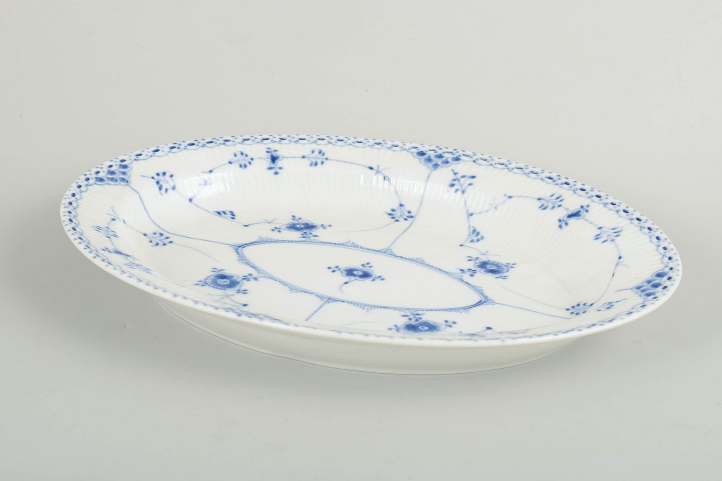 Royal Copenhagen Blue Fluted Half Lace, oval dish.Oval dish in hand-painted porcelain from the Blue Fluted Half Lace service with classic underglaze decoration in cobalt blue, fluted panels and characteristic lace border. Model 1/628. First factory quality. Produced in 1964.