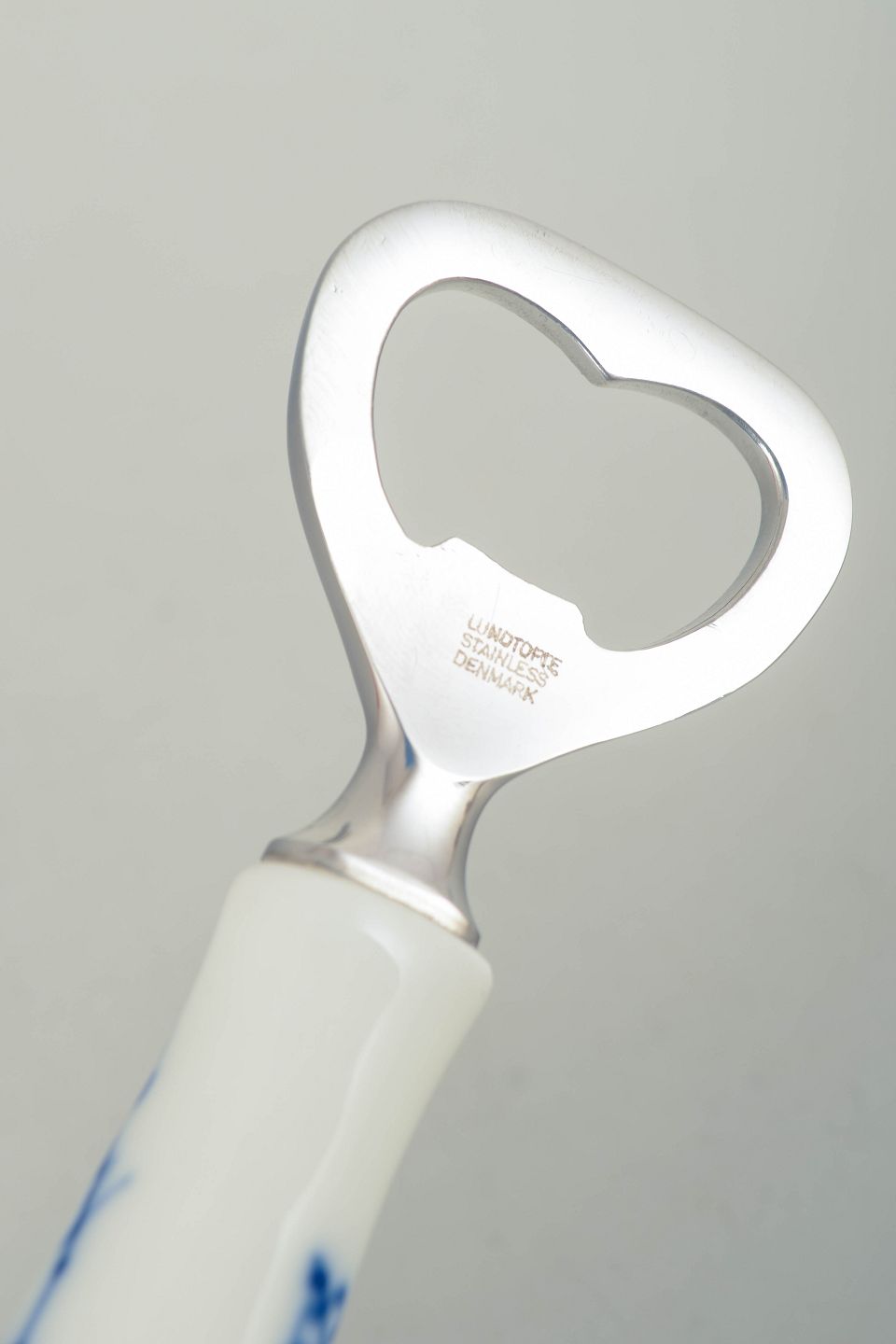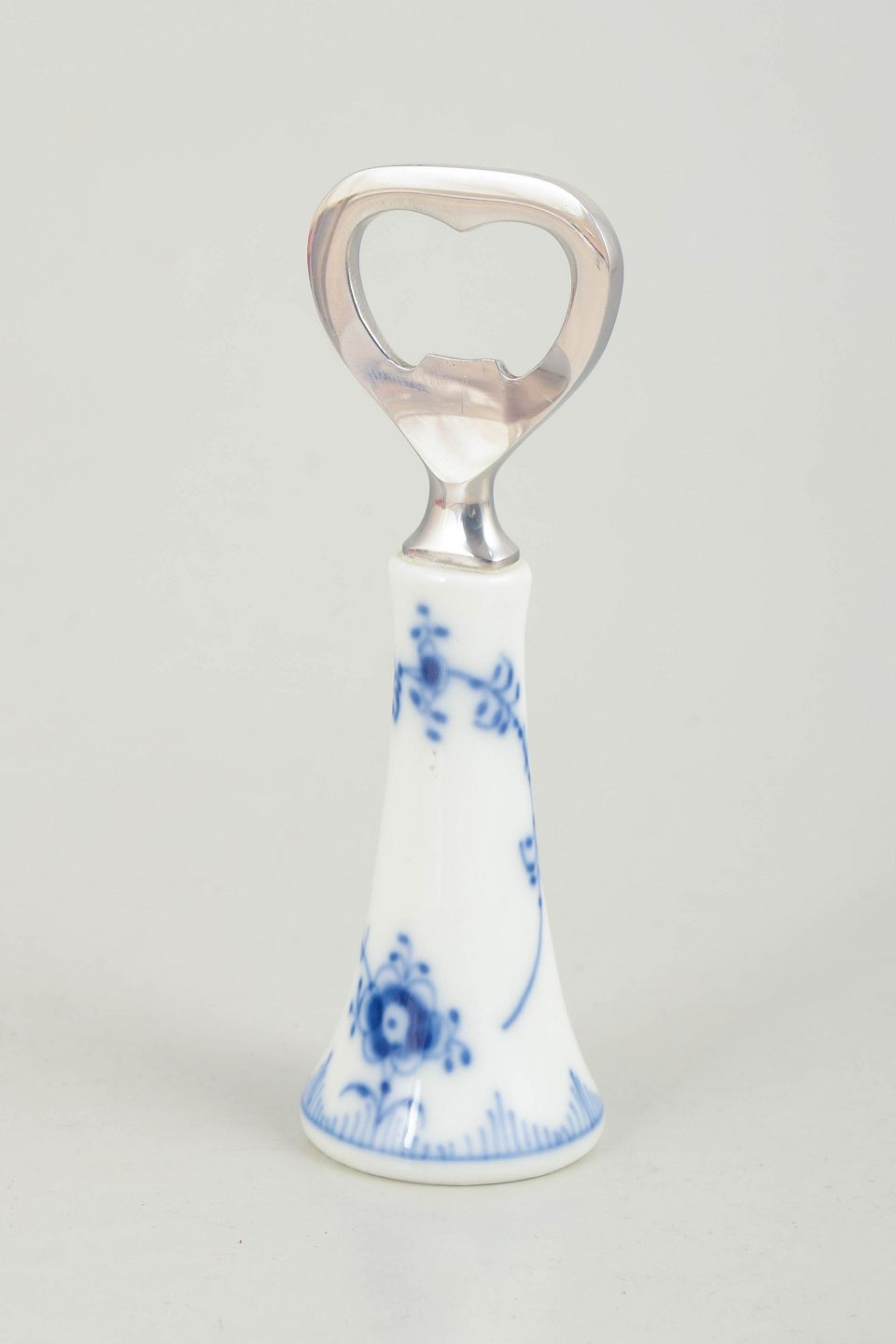 Royal Copenhagen Blue Fluted Plain, bottle opener.Bottle opener in hand-painted porcelain from the Blue Fluted Plain service with classic underglaze decoration in cobalt blue and fitted with a metal opener. Model 1/2309. First factory quality.