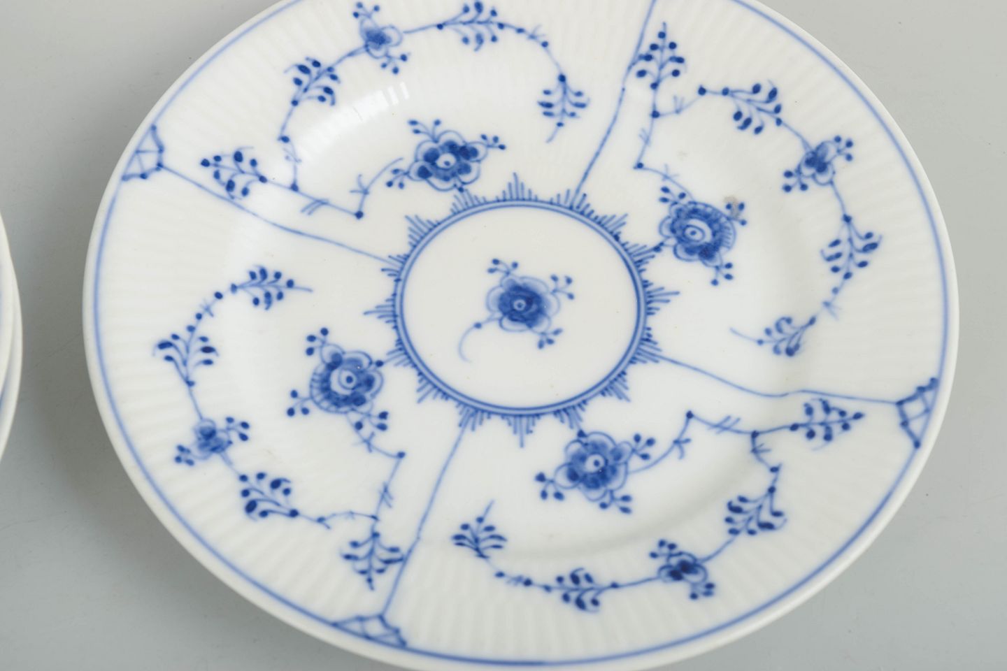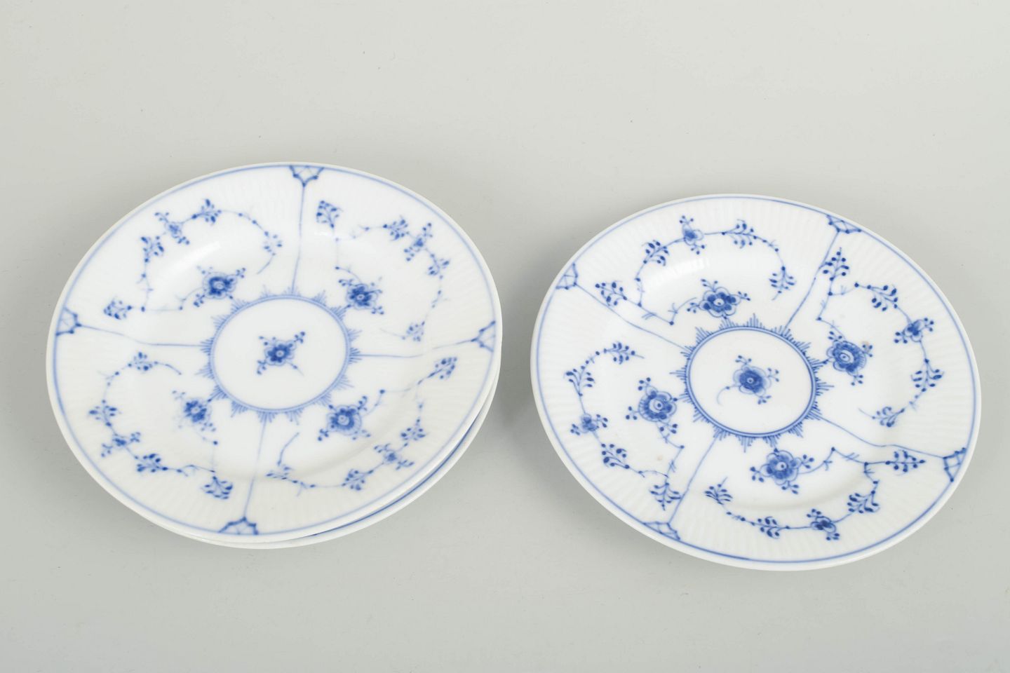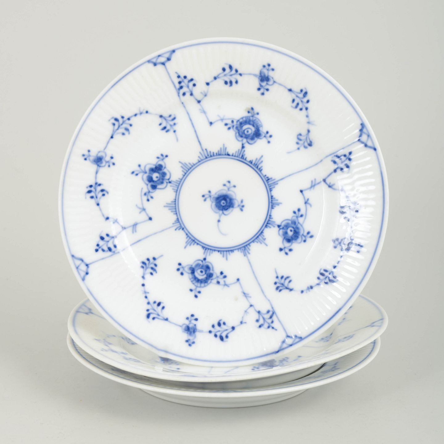 Royal Copenhagen Blue Fluted Plain, set of three cake plates.Set of three hand-painted porcelain cake plates from the Blue Fluted Plain service with classic underglaze decoration in cobalt blue. Model 1/181. Each plate measures 16 cm in diameter. Cancelled with one incised line to the base. Produced in 1950.