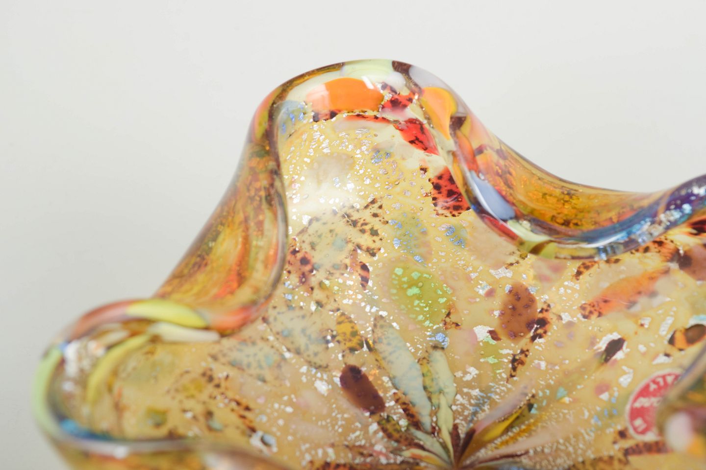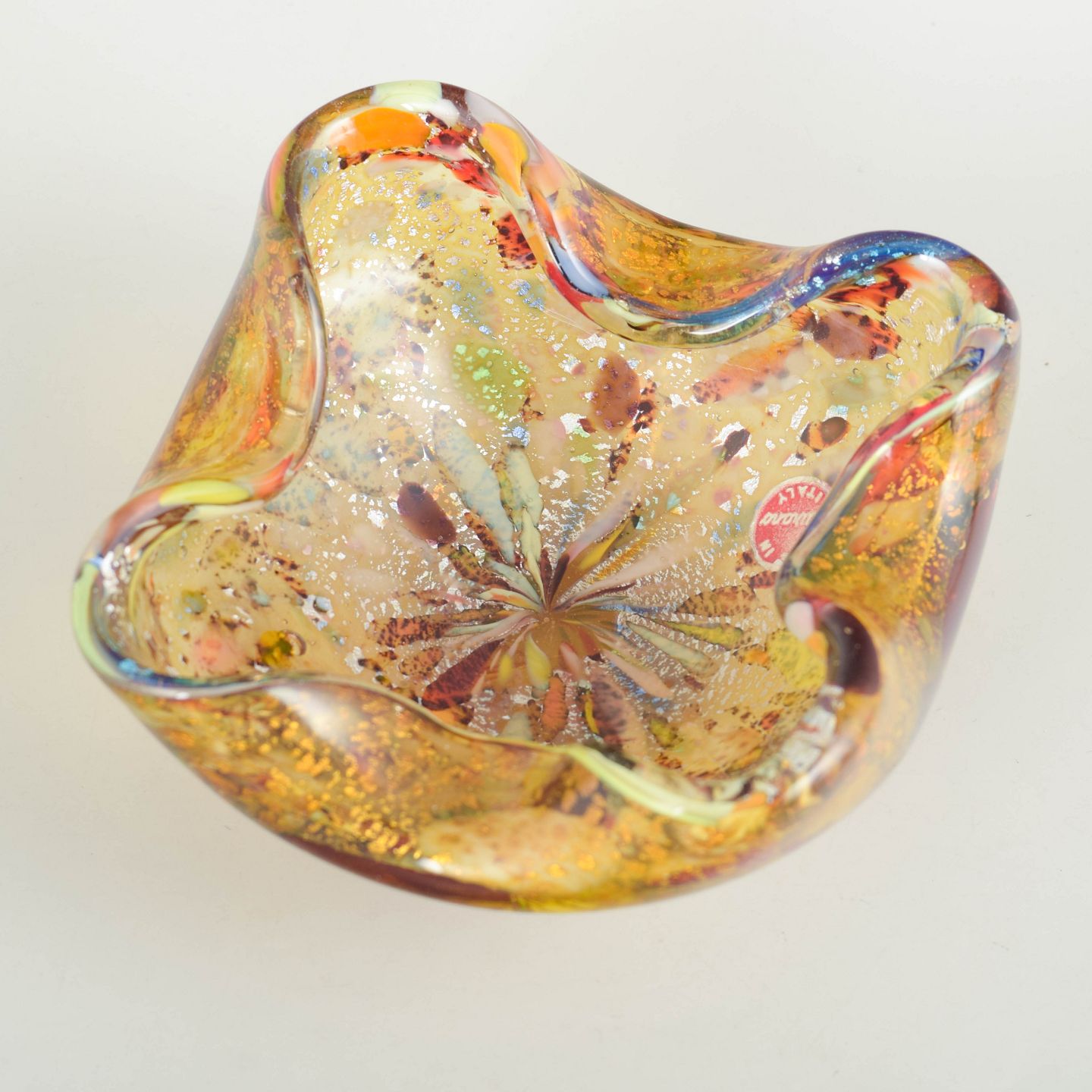 Murano bowl, organic form.Organically shaped bowl in hand-blown glass with undulating rim. Executed in golden and amber tones in aventurine techniques, and multicoloured elements. Original sticker preserved. Produced on Murano in the 1960s/70s.