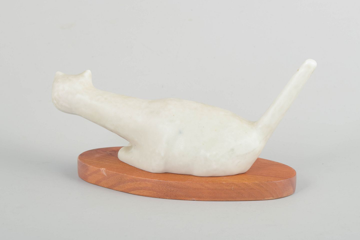 Lillemor Petersson for Rörstrand, cat figure on wooden stand.Naturalistically shaped cat in white stoneware with an elongated, stylised body and raised tail. The figure is standing on an oval wooden base and displays a restrained modernist design characteristic of Rörstrand’s mid-twentieth-century production. Factory mark cancelled with one incised line.