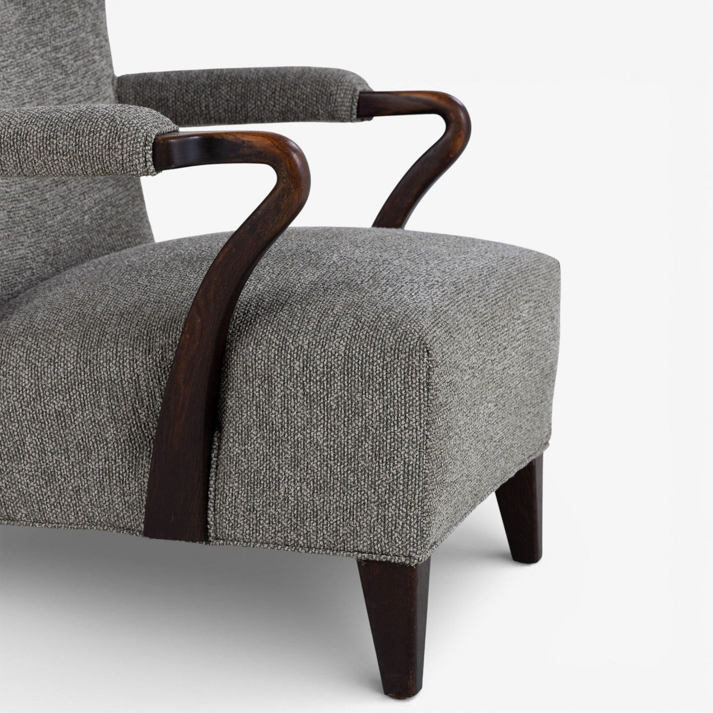 High-backed armchair upholstered in new 'Moss' fabric (color: 0002) with arms and legs in stained oak.