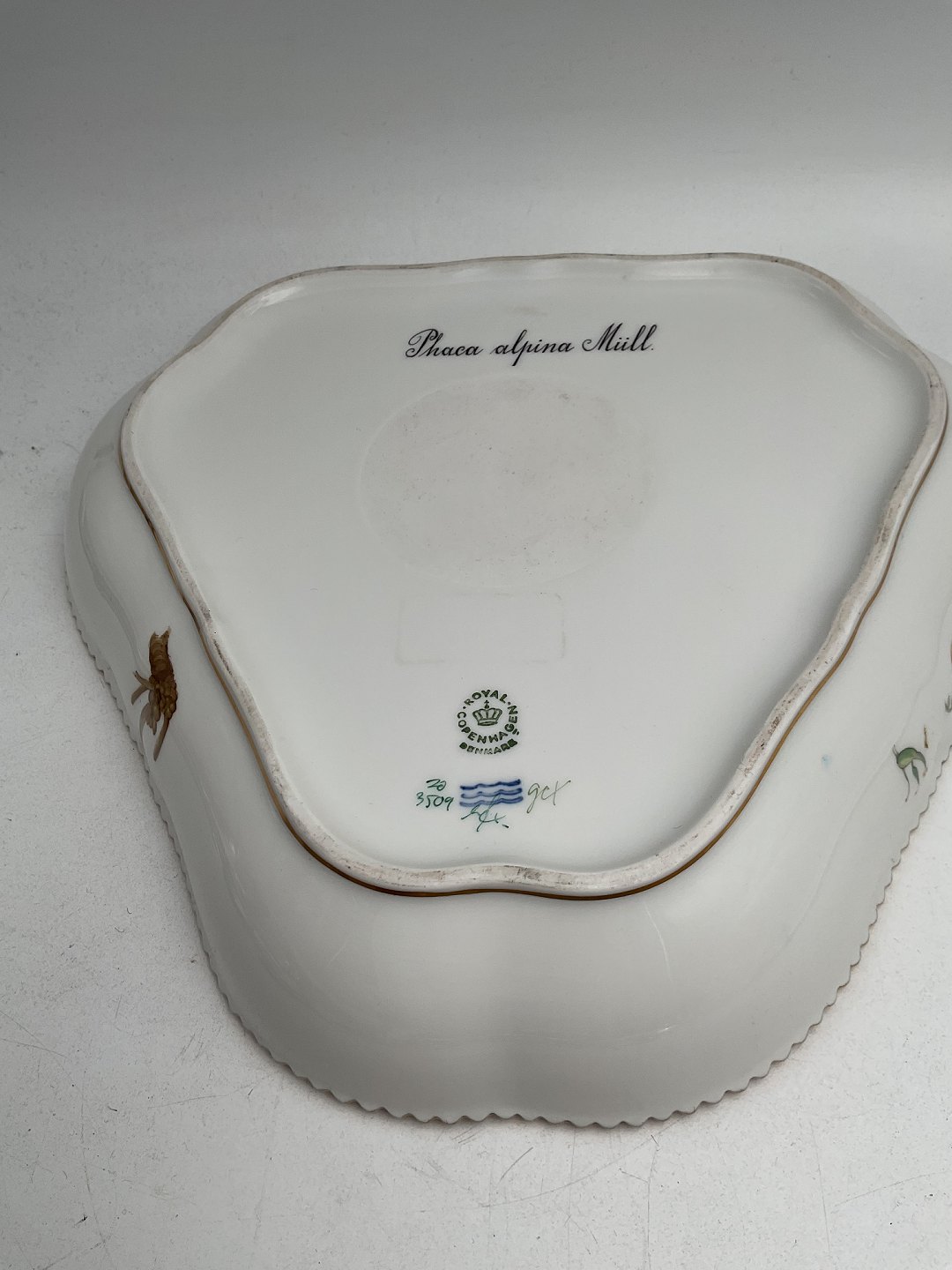 Royal Copenhagen Flora Danica Triangular Bowl No 3509.Latin name: Rosa alpina Mull
