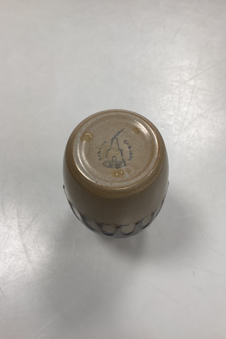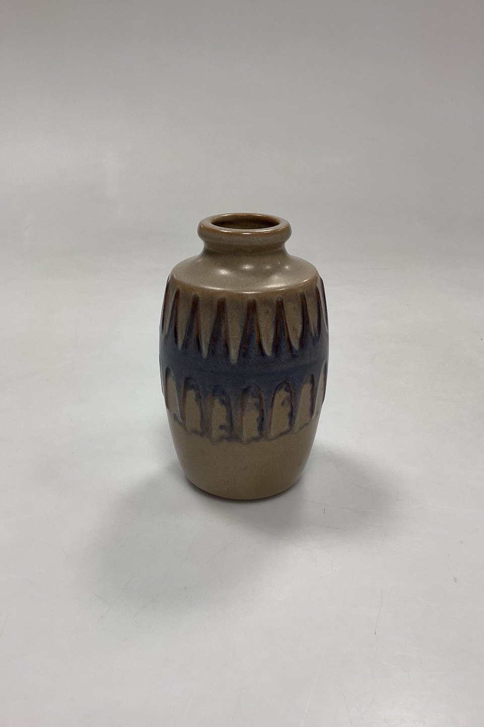 L. Hjorth Ceramic Vase. Beige, brown and blue glaze with modern graphic decoration.Measures 12.3 cm / 4.84 in.