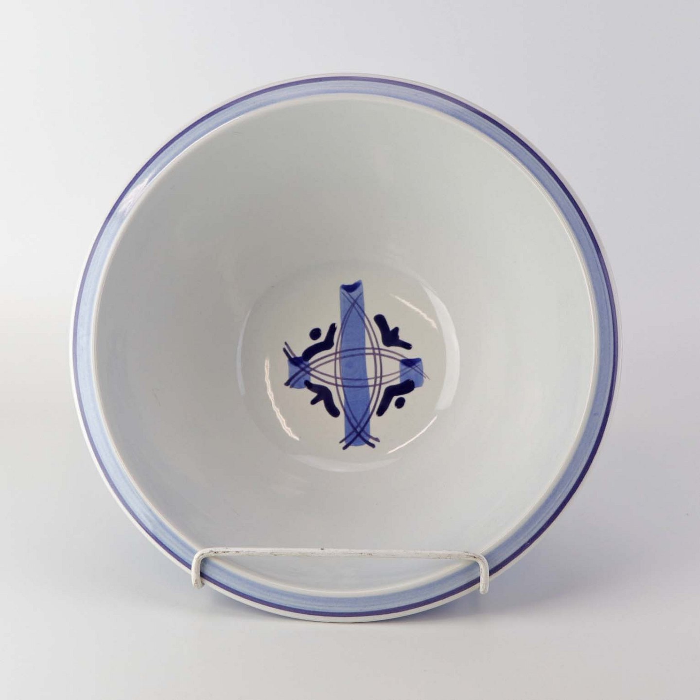 Fajancestel i stelform CA med dekoration af abstrakt motiv i blå og lyseblå på en råhvid baggrund.