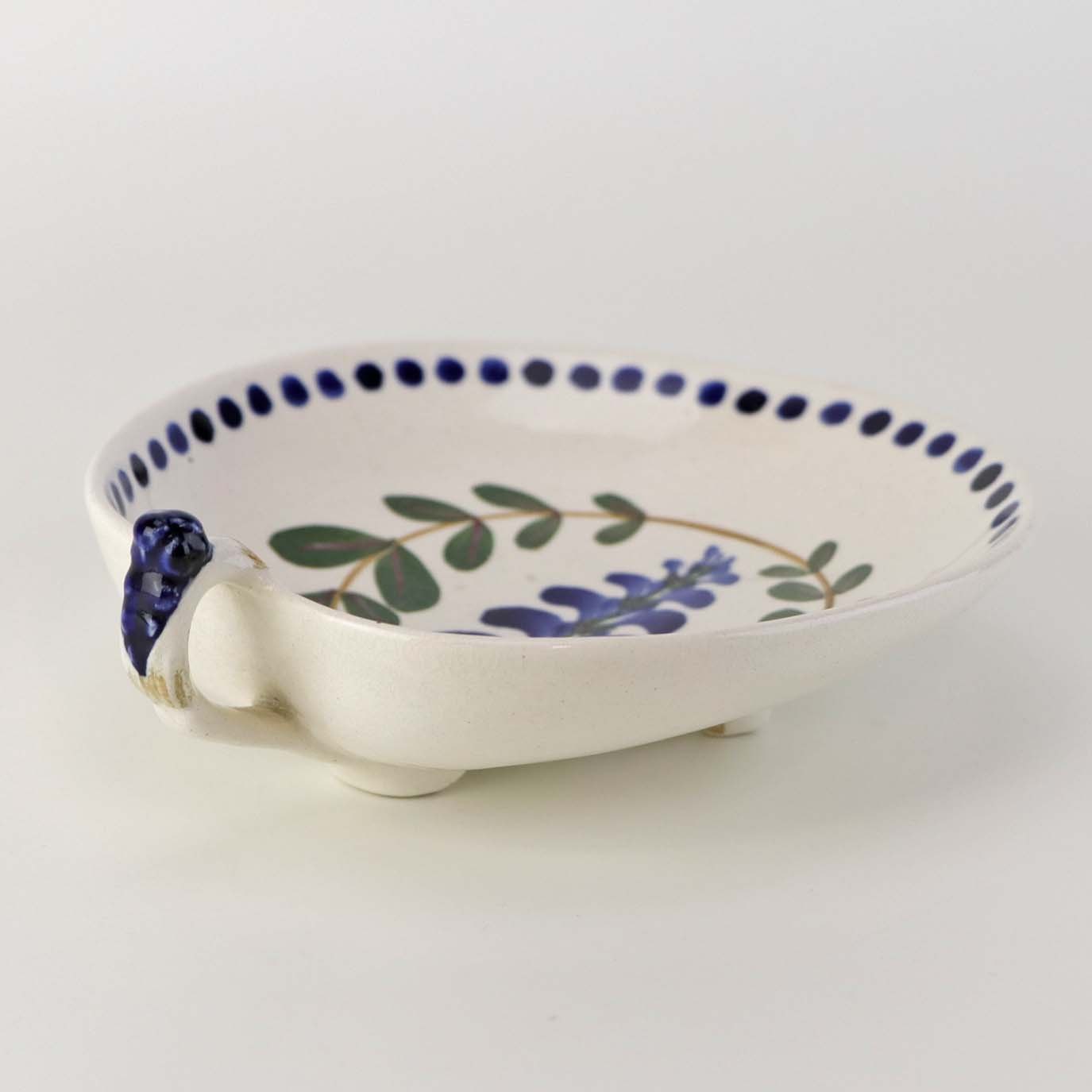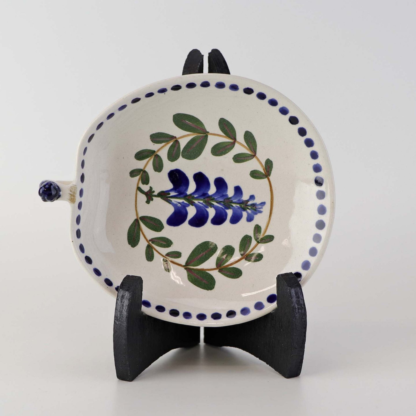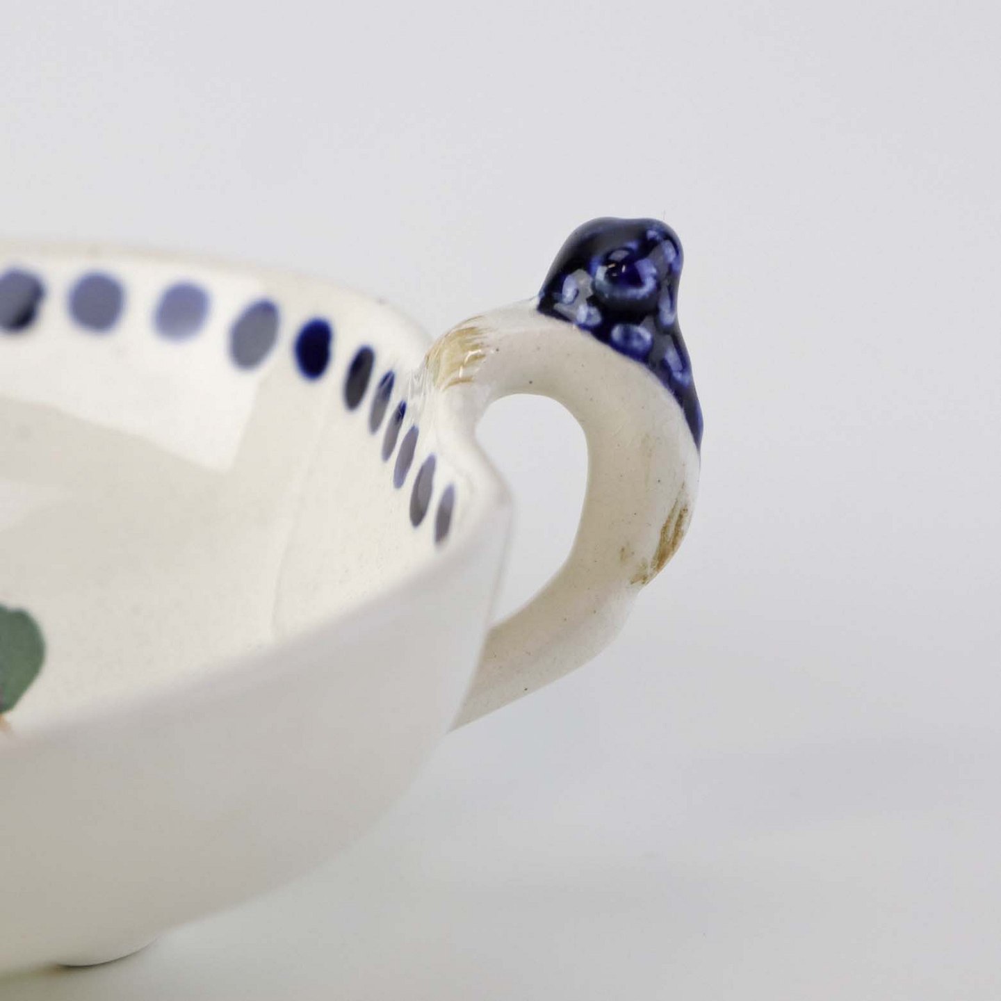 Lille asiet på fod og med hank i fajance fra stellet Blåregn. Stellet er fremstillet i perioden år 1903-1933. Nr. 522/187Formgiver Christian Joachim
