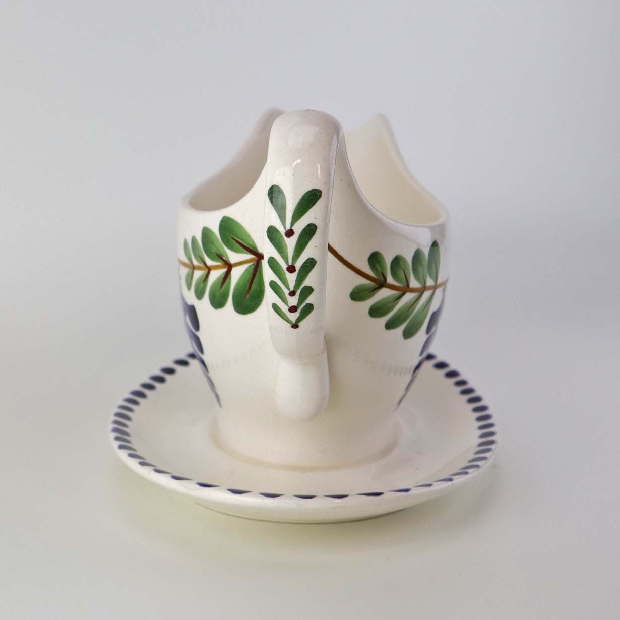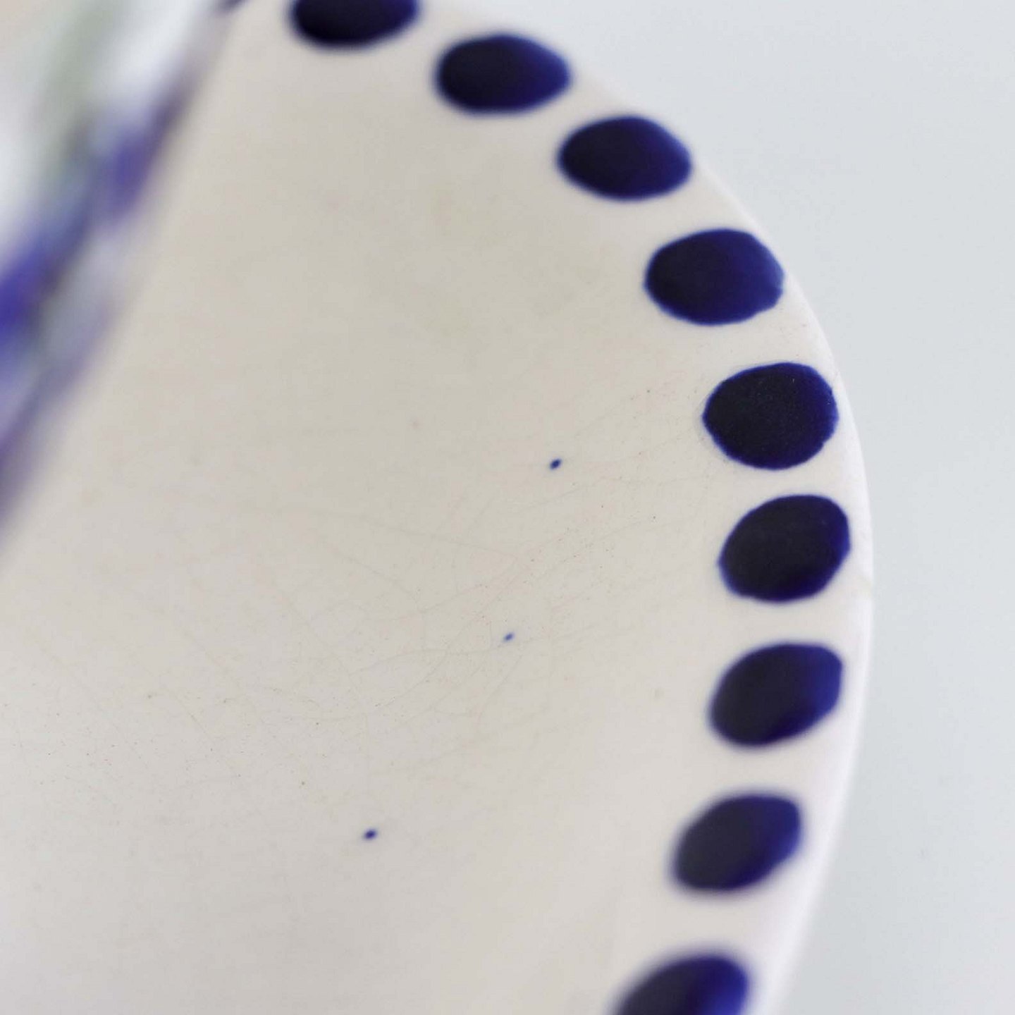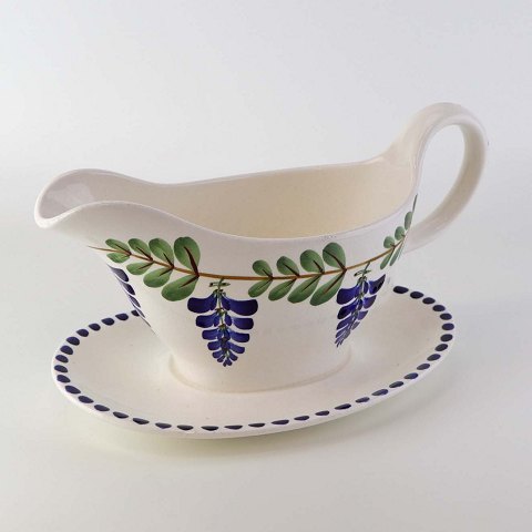 Fajancestel med dekoration af ranker af blåregn og blade på lys baggrund afsluttet med kant af runde blå pletter.