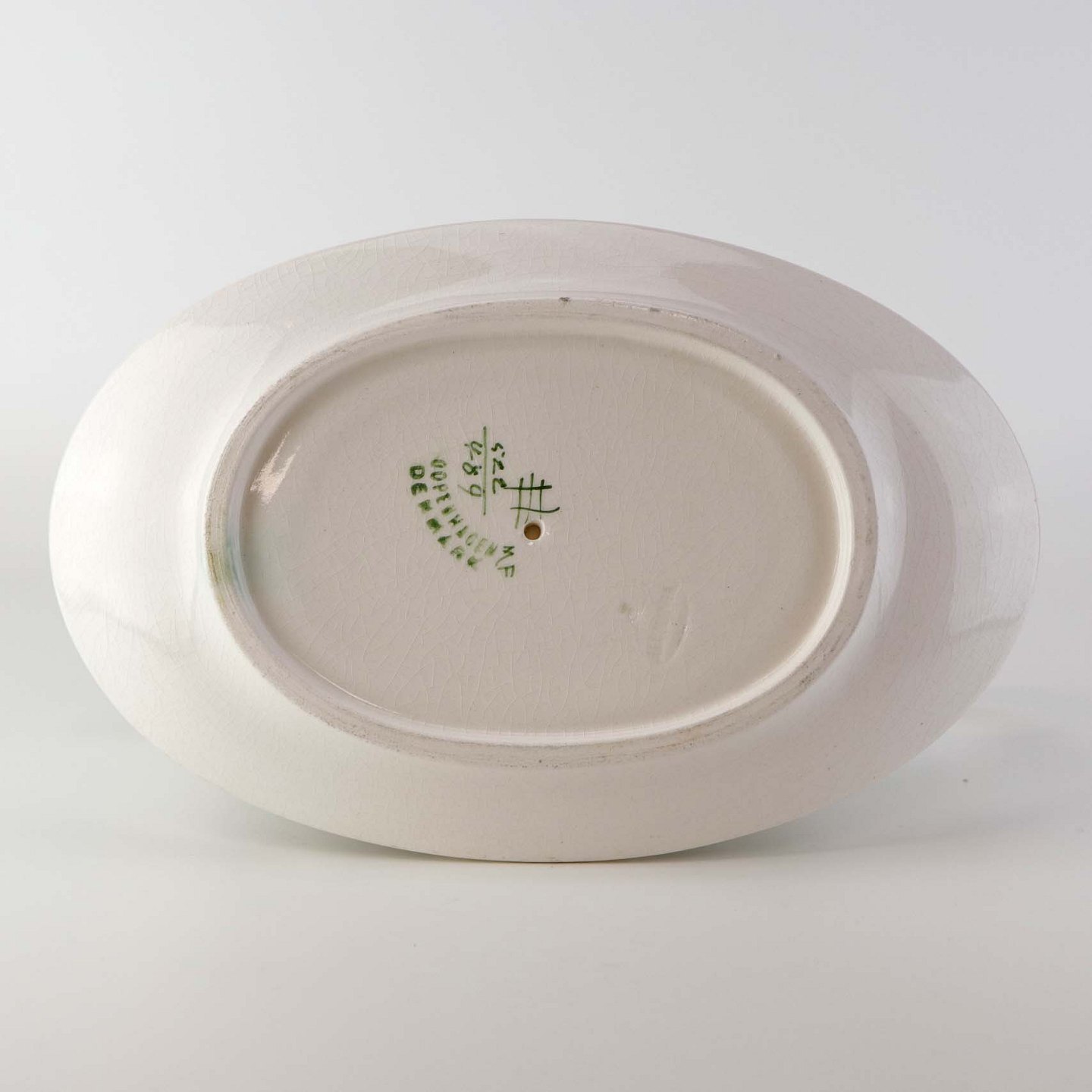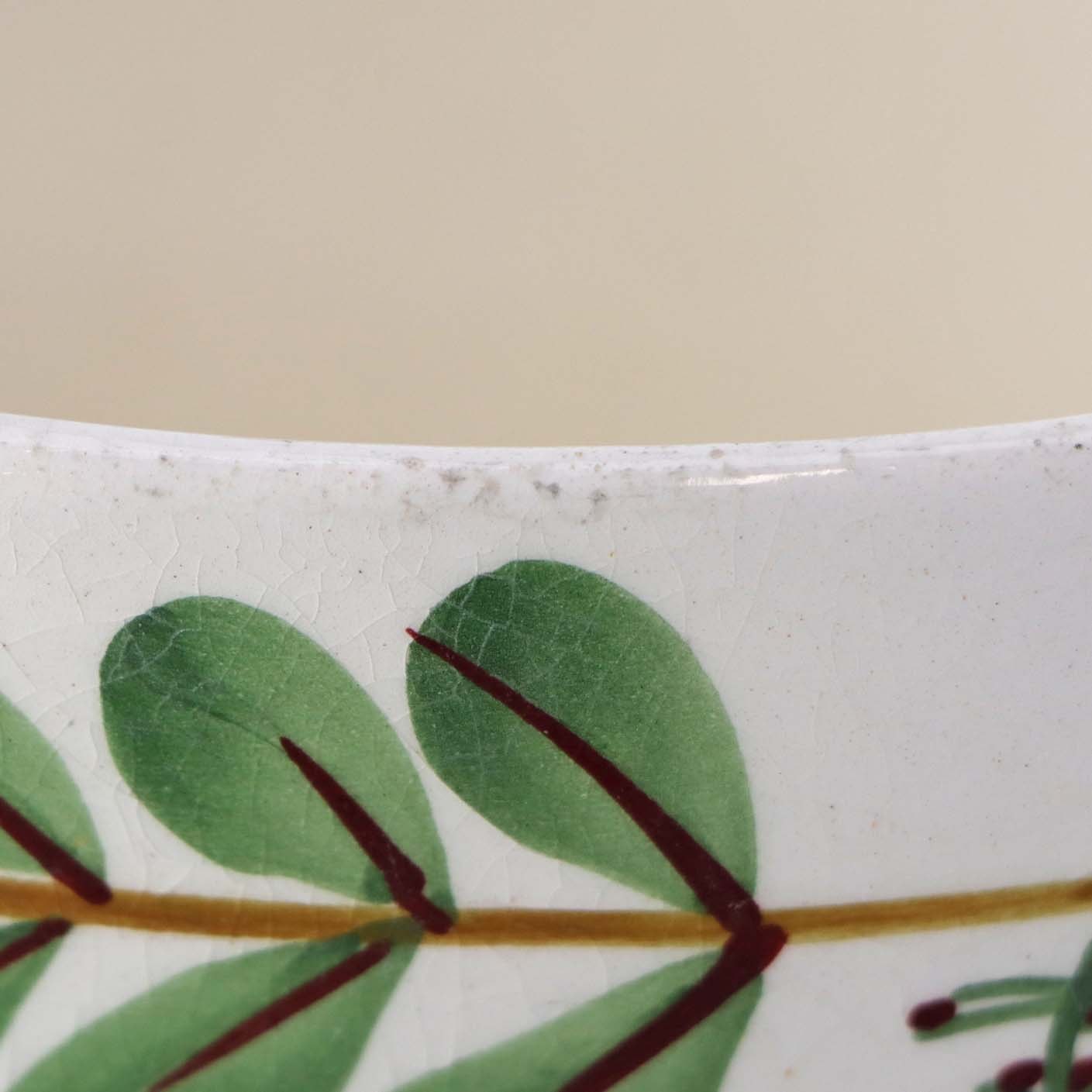 Fremstår med krakkeleringer i glasuren, tre små pletter under glasuren samt brugsspor ved topkanten.