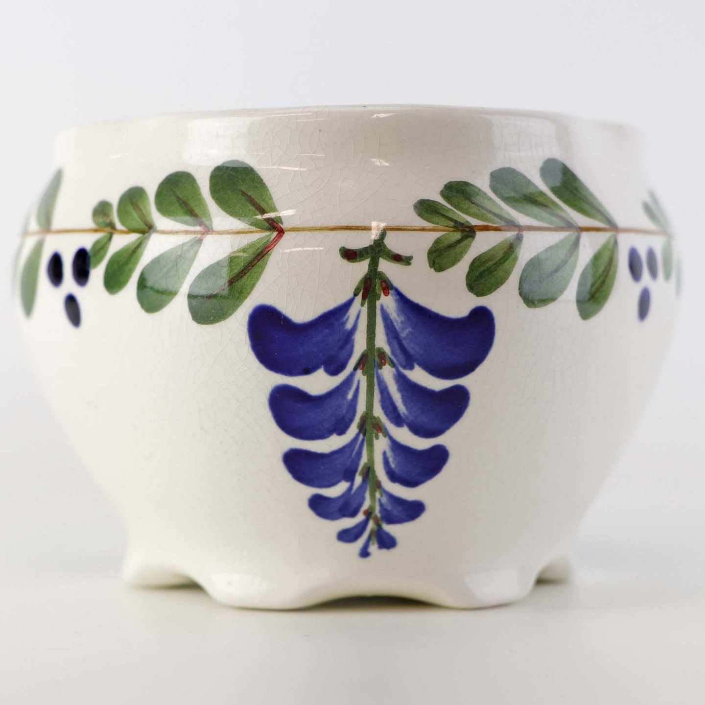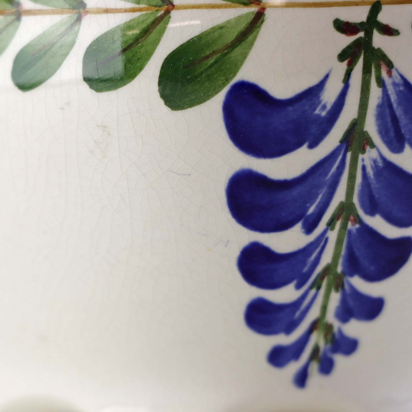 Fajancestel med dekoration af ranker af blåregn og blade på lys baggrund afsluttet med kant af runde blå pletter.