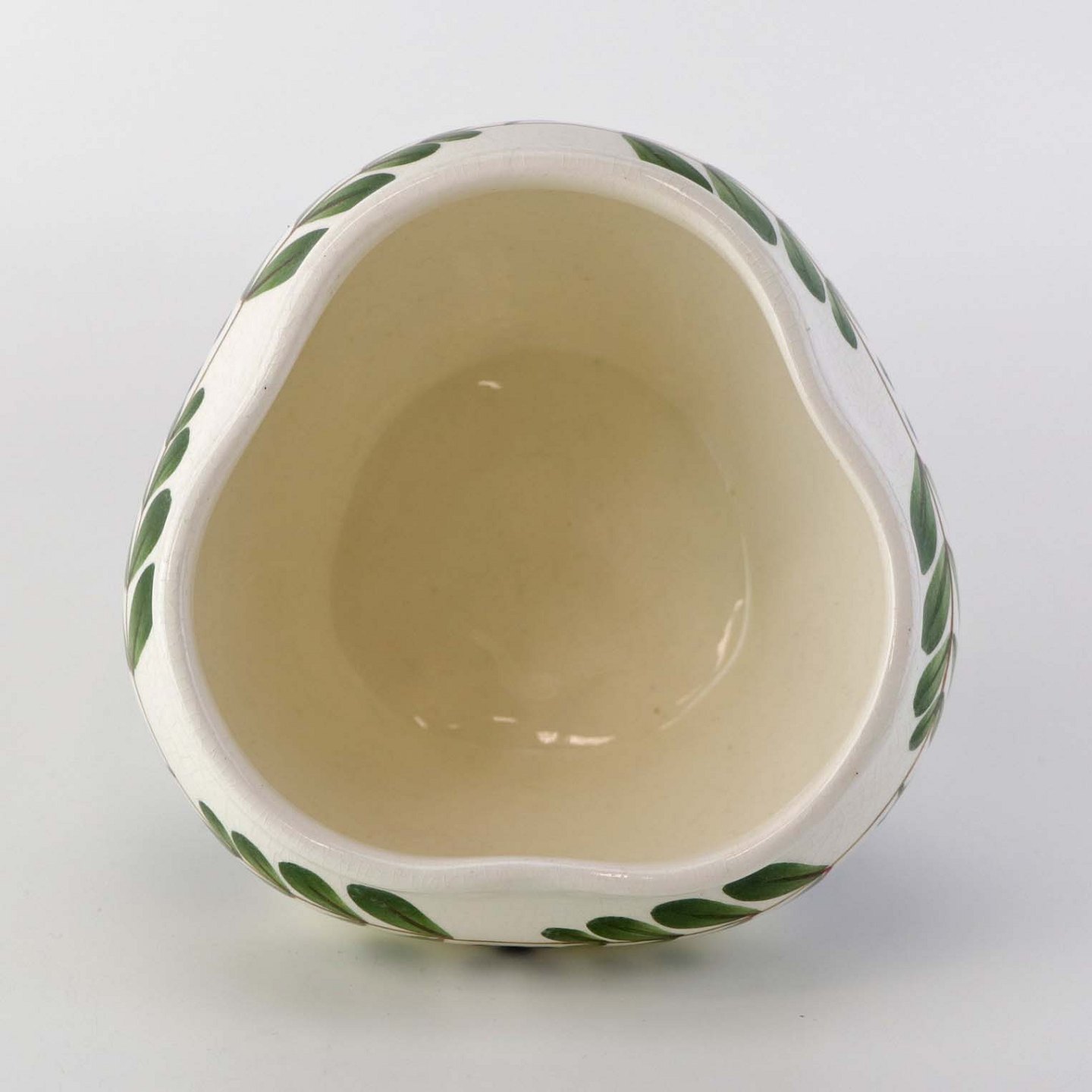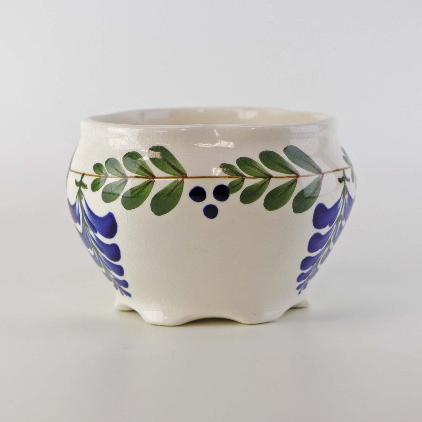 Fremstår med krakkeleringer i glasuren samt to minimale blå streger et sted under glasuren.