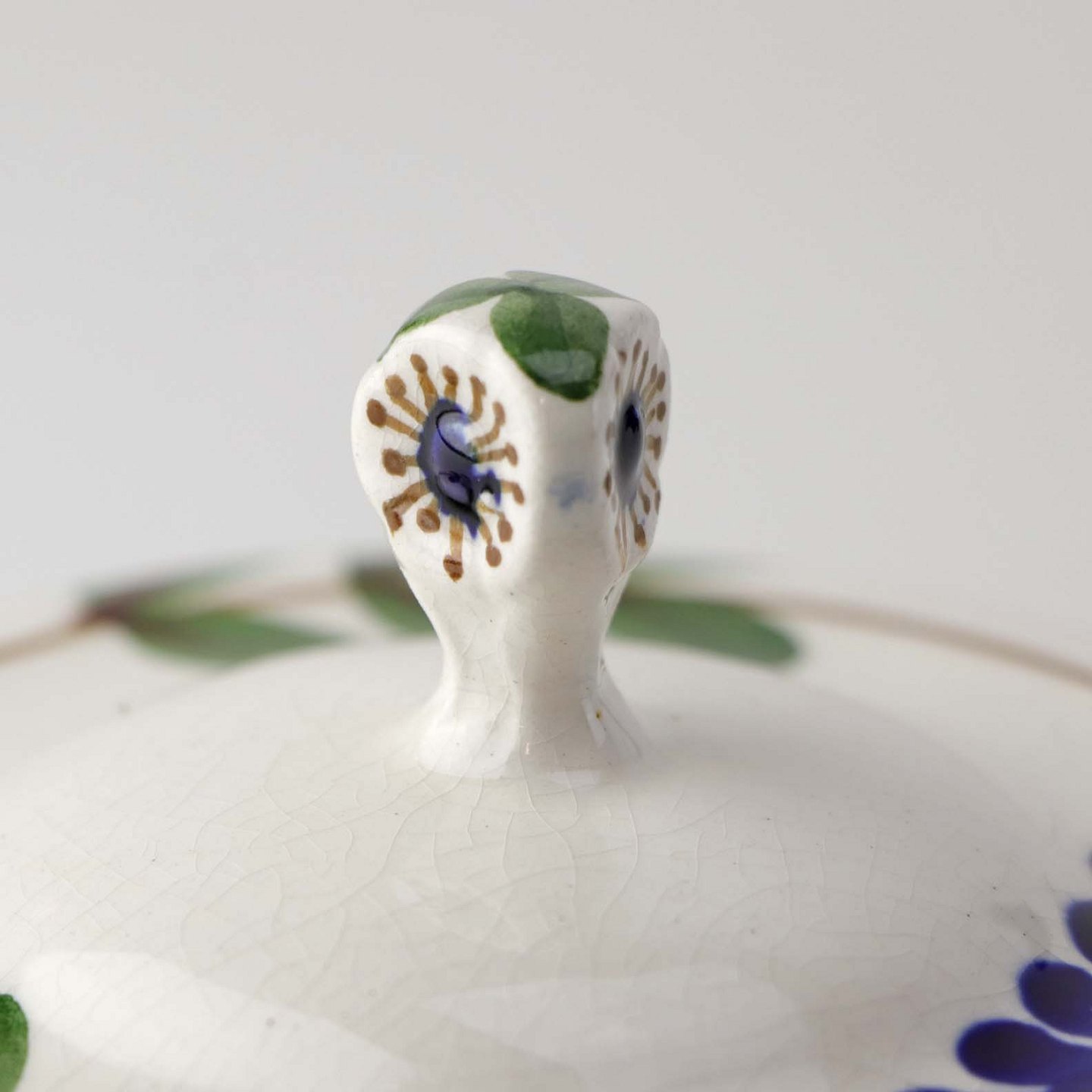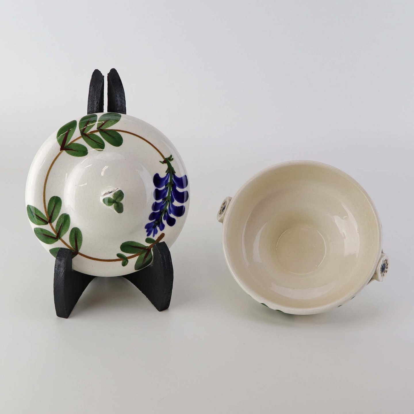 Lågkrukke til sukker i fajance fra stellet Blåregn. Stellet er fremstillet i perioden år 1903-1933. Nr. 522/432Formgiver Christian Joachim
