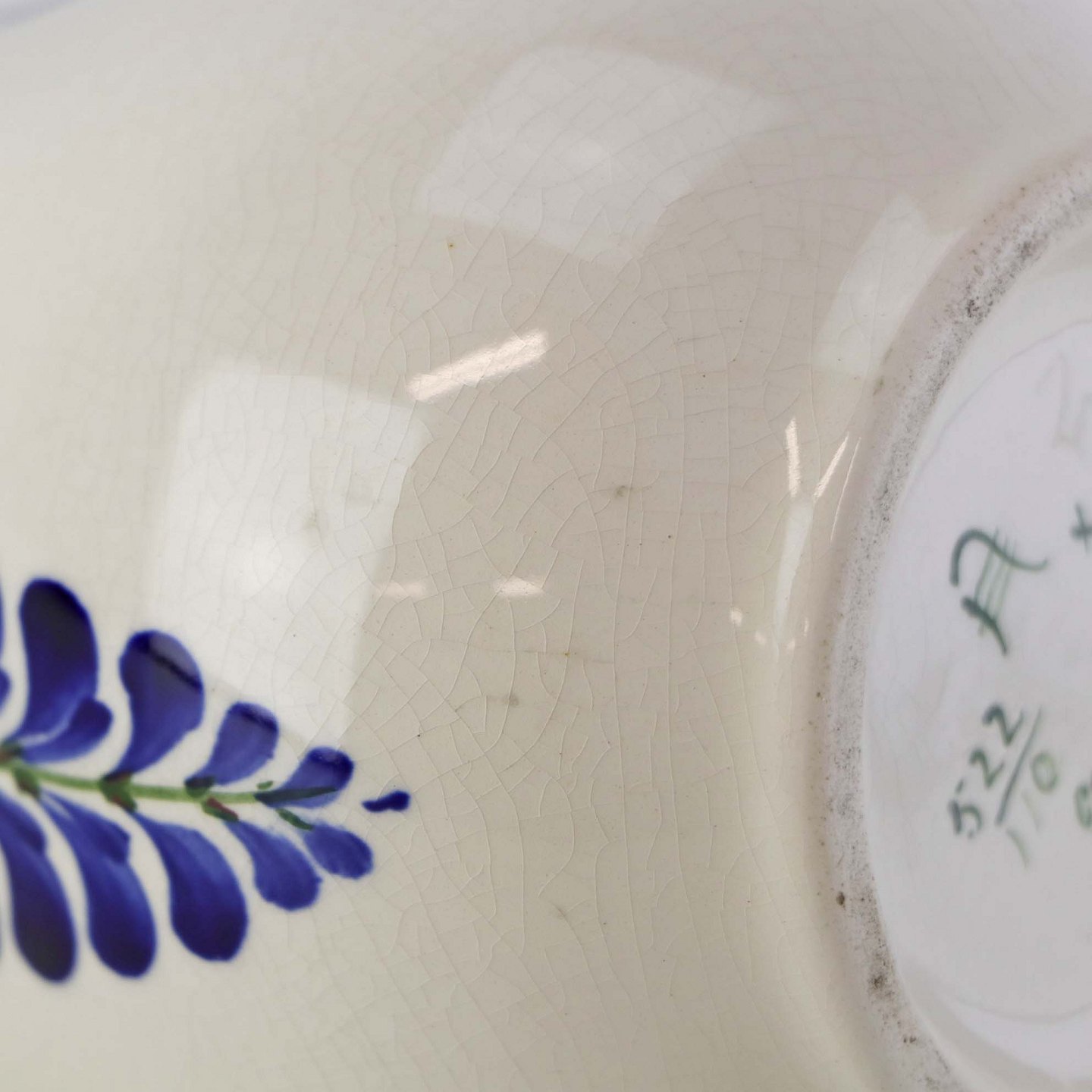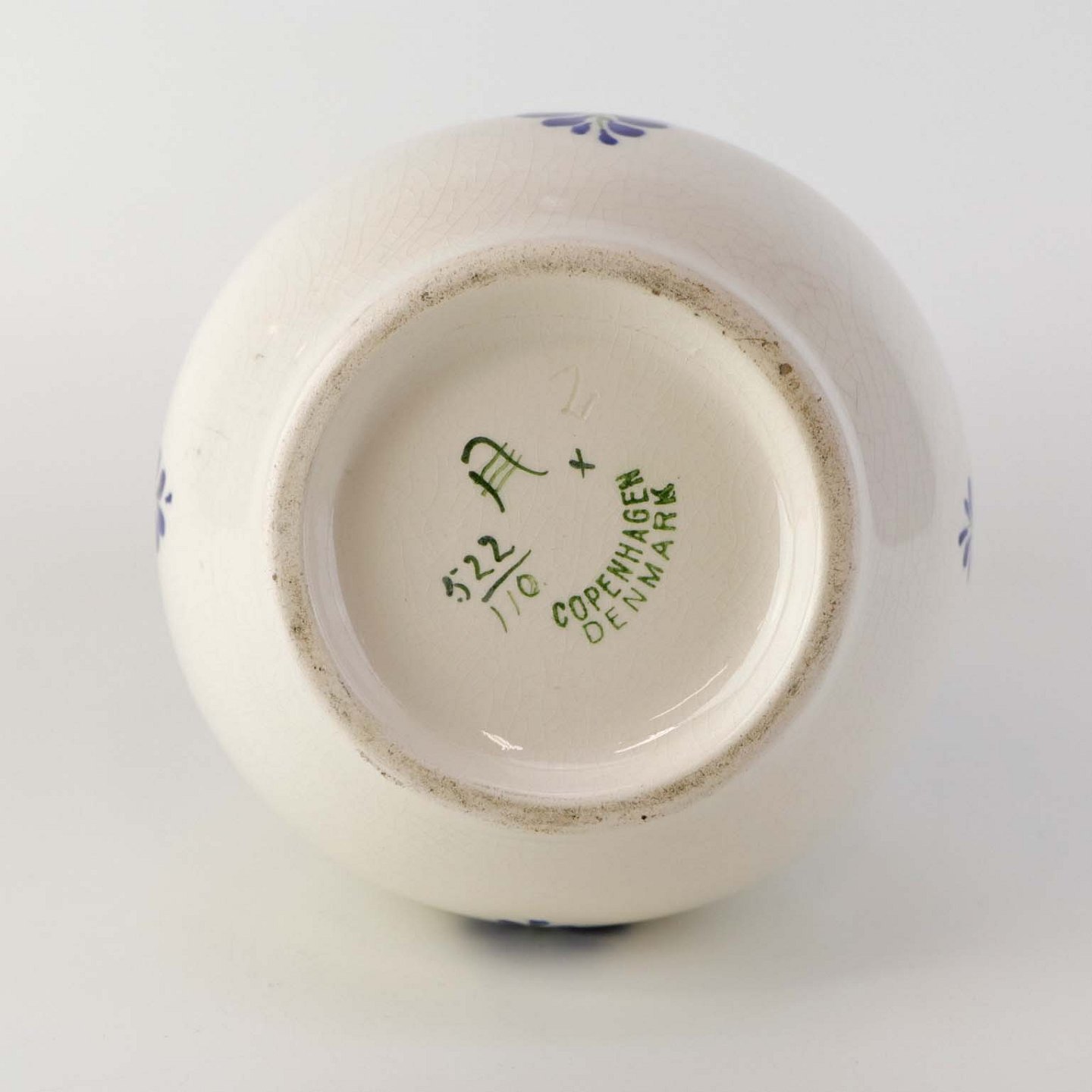 Fremstår med krakkeleringer i glasuren, indvendige spor af kalk samt minimale pletter under glasuren nær bunden.