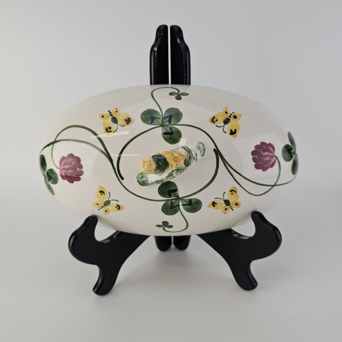 Kløver er fajancestel med motiv af rødkløver på lys baggrund.