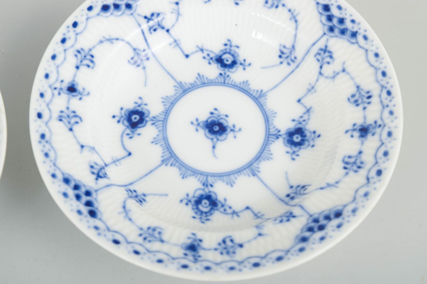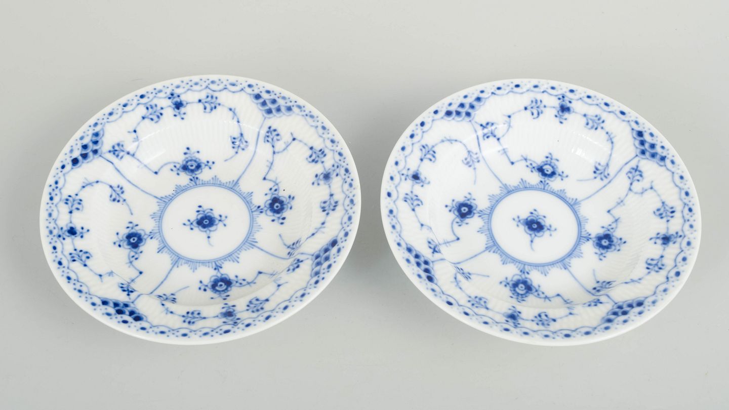 Royal Copenhagen Blue Fluted Half Lace, set of two small deep plates.Set of two small breakfast deep plates in hand-painted porcelain from the Blue Fluted Half Lace service with classic underglaze decoration in cobalt blue, fluted panels and characteristic lace border. Model 1/569. First factory quality. Produced in 1963.