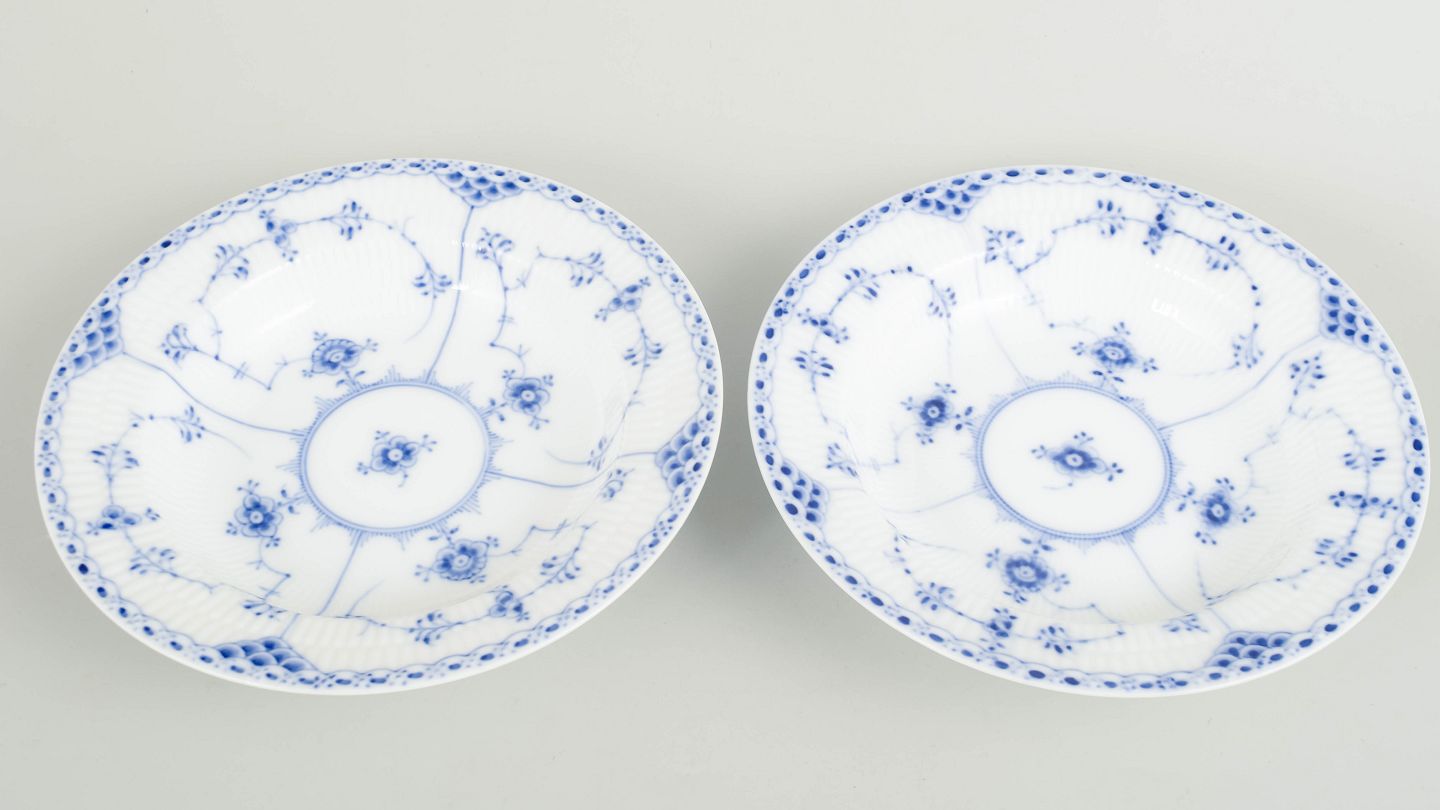 Royal Copenhagen was founded in 1775 in Copenhagen under royal charter. The factory is internationally recognised for its hand-painted porcelain and high artistic standards. Blue Fluted Half Lace is a variation of the classic Blue Fluted service, combining fluted surfaces with a decorative lace border executed with exceptional craftsmanship.