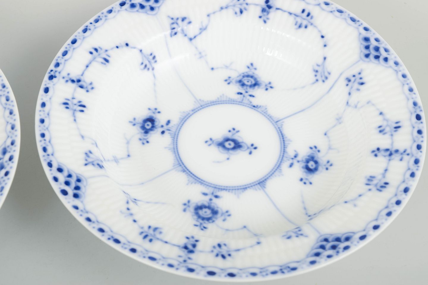 Royal Copenhagen Blue Fluted Half Lace, set of two deep plates.Set of two hand-painted porcelain deep plates from the Blue Fluted Half Lace service with classic underglaze decoration in cobalt blue, fluted panels and characteristic lace border.