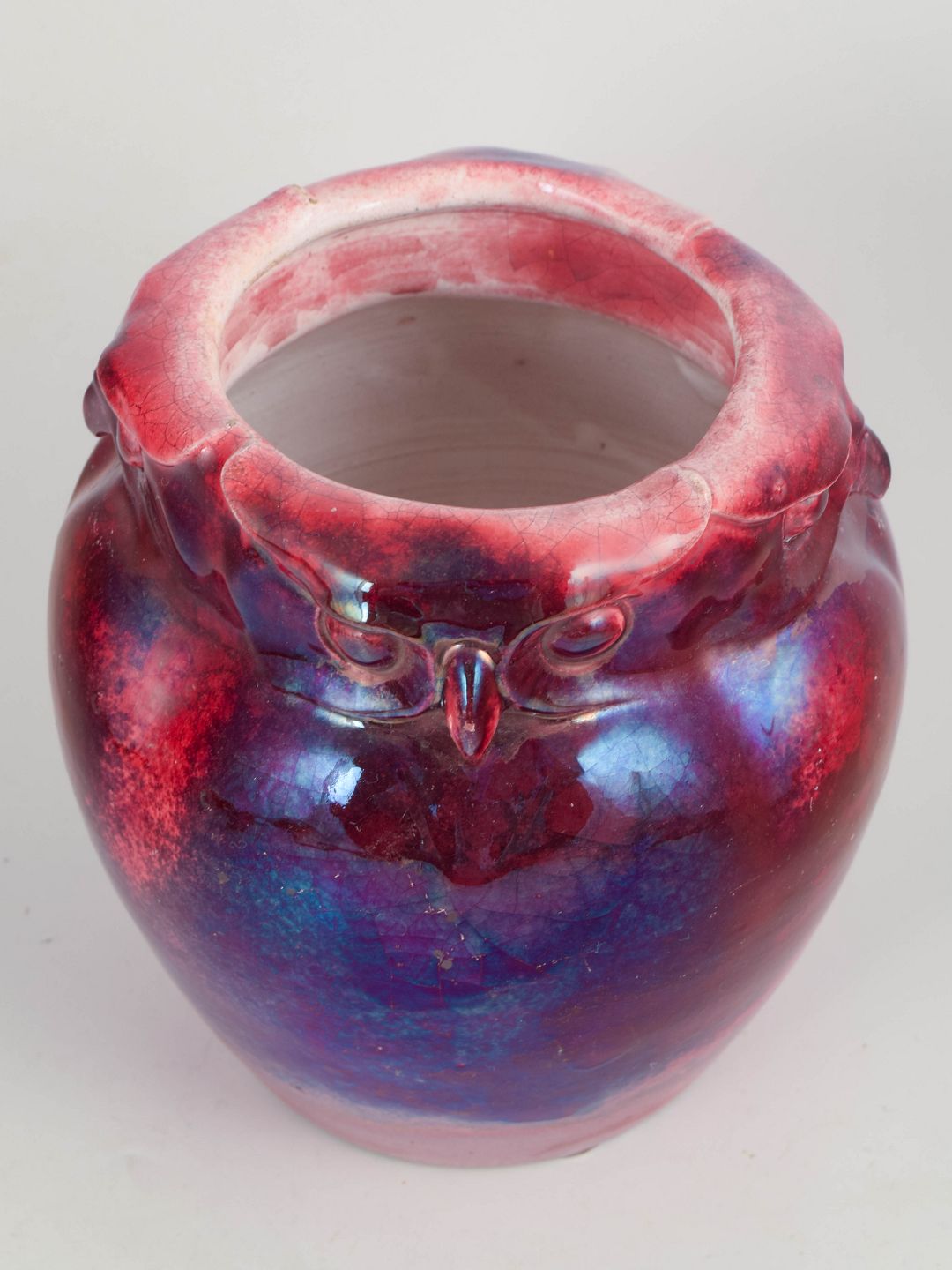 Karl Hansen Reistrup for Kähler, owl vase. Luster glaze.Unique art pottery owl vase with sculptural owl decoration along the rim and iridescent glaze in red and blue tones. Produced at Kähler in the 1890s during Karl Hansen Reistrup’s tenure as artistic director from 1888.